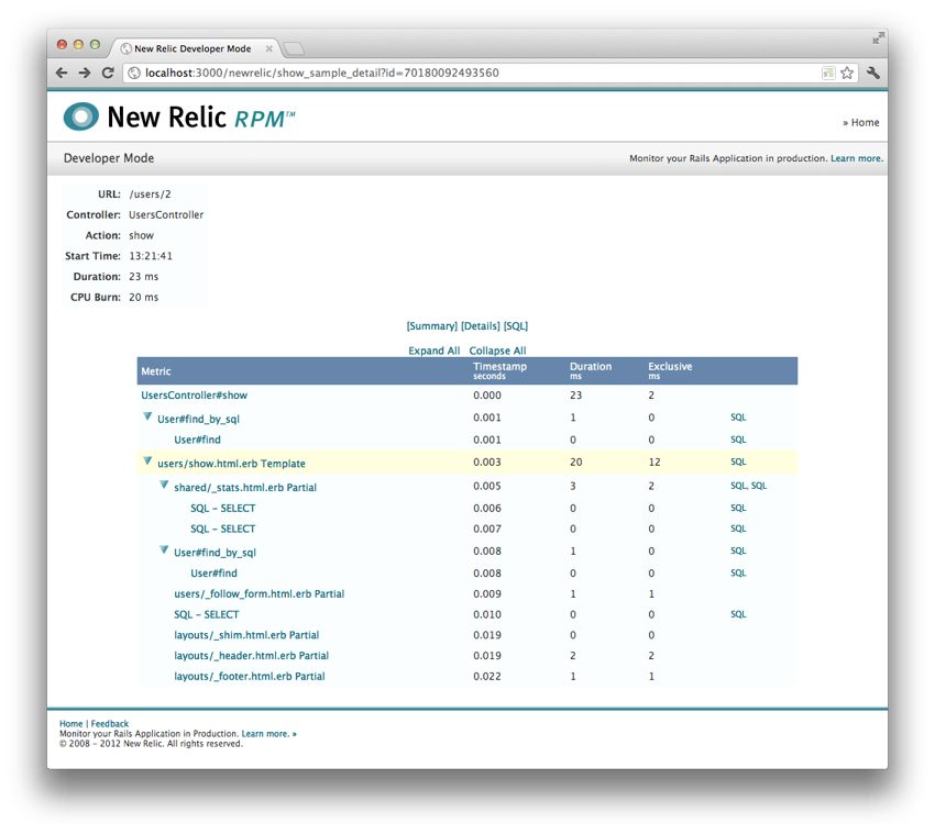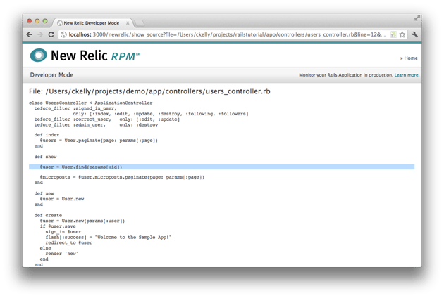 From the Detail view (as shown below), you can explore each step of the request, starting from the controller and action being called, through each additional method, template and SQL query. Clicking on a line like User#find_by_sql will take you to the exact line of code that made that method call (below, lower).