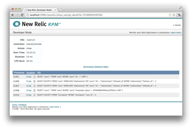 You'll be able to immediately see in-depth transaction traces, including response times, individual method calls and SQL queries. Developer Mode jumps straight to the code block that is being executed, something you can't do on the normal rpm.newrelic.com site.