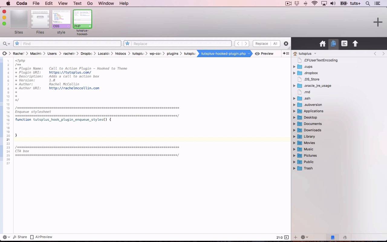 Hello, and welcome back to this Tuts+ plus course on practical projects to learn to code plugins. In this part of the course, I'm gonna show you how to create a simple call to action box and then hook that to an action hook in your theme. And as we work through the course, we'll take that call to action box and activate it via different types of plugin which you'll see as we get along, but first, the simplest way. Activating a plugin via a hook is the most common way to do it. And the most common way within that is to use a hook that already exists within WordPress. And WordPress includes a whole range of hooks which you'll have seen in the previous part of the course. But in this part of the course, I'm gonna show you how to add your own hook to your theme and then hook your code to that. And what that does is output the code exactly where you put your hook. So what I want to do is create a call to action box which will go underneath the content of my post. So it'll go down here. So instead of manually coding that into every single post, I'll create an action hook that goes in that point in the loop and then I'll code my function and I'll hook that to that action hook. And I'm only gonna add it to single posts so I'll include a conditional tag in there. Now before we start, it's worth mentioning that I'm using a custom theme that I've developed especially for this project. Now it's aptly the theme that I created for our advanced theme development course which I'll include a link to in the notes for this course. And the reason I'm doing this is because if you want to add custom code to a theme, it has to be your own theme. If you add an action hook to a third party theme, you'll lose that when the theme is updated. So if you want to do that, what you need to do is create a child theme and create a duplicate of the relevant template file and add your action hook into that duplicate. I'm not gonna go into that in too much detail at the moment because this course isn't about parent and child themes, it's about plugins. So firstly, let me show you how we add an action hook to our theme. So here's a template file in the theme, and this is the single.php file which outputs all single posts and pages and other content types. Now I'm gonna be adding the hook to every template file in the theme, not just the single one. And that's because I want to give users of the theme the opportunity to attach code to that hook, wherever they are in the theme. What I'm gonna do is add this code inside the content div and before the closing div tag. So I'll open my php tags, and I use the function do_action. And then I need to give my action a unique name. So I'll call it tutsplus_after_content. I'll close my php text again. So that creates an action called tutsplus_after_content that I can then hook any code to and have it output at that point in my theme. The reason I've called it tutsplus_after_content is because the prefix here tutsplus shows me that I'm developing this for Tuts+, and then after content tells me where it is in my theme. So if you're working with your own theme, you'll need to add something similar to this, but maybe add your own prefix with your name or your initials instead of tutsplus. So I'll save that and then just take a quick look at my theme because I'd already added that code to other files in the theme. So you can see here I've got do_action tutsplus_after_content in my index file. I've also got it in my page file and I've got it in my archive file. So those are the theme template files in my theme and I've added that action after each of them. Now if you wanted to, you could add an action just in one template file, and it could just be for that content type. I prefer to add them to all my files and then use conditional code, conditional tags to select when my code will be output because I think that reduces any confusion. So let's close all those. And then I'll open my plugin file. So I've created this plug in file already in my plug in directory as you'll see and it's called tutsplus-hooked-plugin and I've already created a style sheet for this. So I've created styles for my call to action box which includes layout styling and also the font and the colors and I've also done that for links. So you could use whatever styling you want for your own plugin. Now let's go back to the actual plugin file. So I've opened up my plugin file already, I've called it Call to Action Plugin -hook to theme. And the reason I've done that is because I'll be creating multiple plugins called call to action plugin, but each of them needs to have a unique bit here so I know which one is which. Because we're gonna be creating more with short codes and widgets as well. The first thing I need to do is enqueue that style sheet that you already saw. And we covered enqueuing and including files a little bit earlier on in the course, so you'll be familiar with that. But let me just take you through the code. So firstly, I'm gonna create a function which will enqueue that. So that's my function, I'll open my braces for it where the code will go and then I'm gonna add the hook. So this will be hooked to the wp_enqueue_scripts hook. And the second parameter for add_action is the name of my function, so that's tutsplus_hook_plugin_enqueue_styles. I know that seems a bit lengthy, but because I'm running multiple plugins with similar names here, I've gotta make them as unique as possible. Now we need to populate our function. So that's the first part of my function which is registering that style, which I've called hook_cta_css. And the file for that is relative to the URL of this particular file, this plugin file. So you can see, let me show you the structure again in my plugin css and then style.css. So you can see plugins_url which is the URL where this plugin file can be found, and then css/style.css. And I'm missing a comma there, just add that there. Okay, so the next line of my code is where I enqueue that s