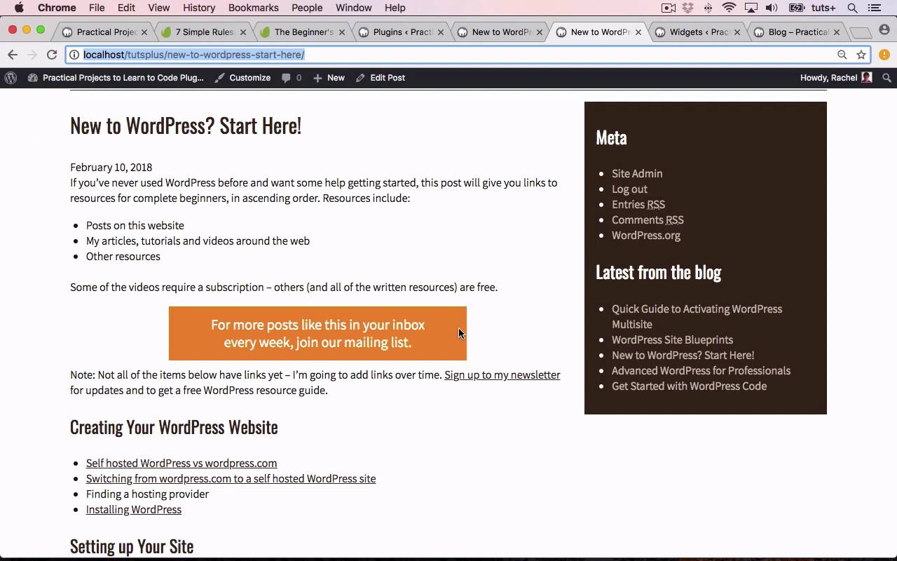 Hello, and welcome back to this Tuts+ course on Practical Project to Learn to Code Plugins. In this part of the course, I'm gonna recap on what you've learned during the course. So we started off by looking at some best practices for the plugin development. And I gave you some simple rules such as how you name your files, how you structure your plug in folders and how you make sure that you're using the WordPress coding standards. We then moved on to looking at plugins that are activated via hooks. And I gave you an overview of action and filter hooks and how they work, and then we created a plugin to do that. So during the course we created a number of plugins, but the first one was Hooked to Theme. So we created the code for that plugin, hooked it to a hook that we added to the theme, using our own theme, and then activated it to show it on the site. We then move on to looking at creating short code plugin. So we created the code for a shortcode plugin, again and queuing the style sheet and using that, and we created a simple plugin that outputs some text within a link. And you can see that in the post here. We then moved on to creating some slightly more complex shortcode plugins. So firstly, we created a shortcode which enables the user to add the content In Aetween the opening and closing short code text. And that have the same effect of adding this text, although obviously, the user could change it and add their own text. Having done that, we created a more complex plugin with some attributes and parameters. And that allowed the user to define the plugin's parameters using the text and link attributes. So again, it outputs something very similar depending on what we typed in as our attributes. Having looked at short code plugins, we looked to creating a widget plug-in. And I took you through the process of creating a widget class to extend wp widget class which consisted of a construct function. A form function, a function to save the data, and then a function to output the widget. As well as, finally, outside that class, the function to actually register the widget to our site. And that created a widget that was added to our widgets screen in the admin and then was output in the sidebar widget area of our site. So that's giving you some examples of the different kinds of plugin that you can create using WordPress. Now, in every case, we've created a call to action box. And we've done that differently, which shows you how those different methods of creating plugins work for a very similar scenario. But you can then apply this to whatever plugin you need to develop for your site. I hope you found this course useful, thanks for watching.
