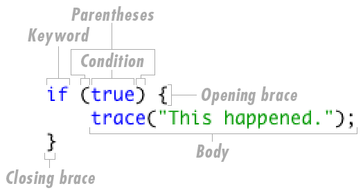 Let's break it down. First, we have the if keyword. This is a reserved word in the ActionScript language that marks the start of an if block. Immediately following this is the condition. The condition goes in between parentheses. Leaving out the parentheses will cause an error; I bring that up because I still sometimes forget to put them in! We'll talk about conditions more in the next step, but for now we'll simply use true as our condition. After the condition is an opening curly brace. This marks the beginning of a block of ActionScript statements that will execute if (and only if) the condition is true. After the block of statement(s) is a closing brace, marking the end of the block.