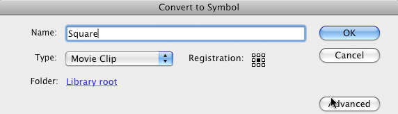 If you run this now, you should have a fully functioning movie, except that it always draws squares. We'll fix that next, but right now I want to point out that onCanvasClick describes our general behavior. The only detail in there that keeps us from being more flexible is the part where it says new Square(). We need to be able to create a new Circle and a new Triangle, as well. But everything else – the shape var, the positioning and adding the shape to the stage – will need to be done regardless of the type of shape.