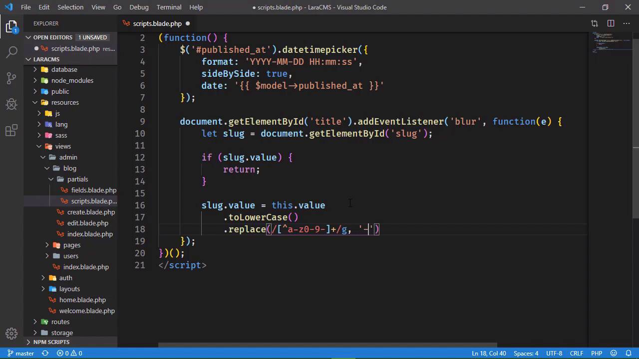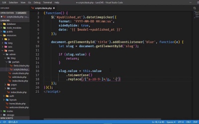 In this lesson, we're going to write some JavaScript that will automatically populate the slug based upon what we type in the title. Now we do need to be a little bit careful here because if there's already a slug, we don't want to overwrite that. So we do need to take that into account and really, that's going to be very easy to do. So let's start by retrieving title elements. Now we could use jQuery in order to select the elements that we need and use the jQuery API for getting and setting the value of those fields. But for something this simple, let's just use plain ordinary JavaScript. So we first of all want to retrieve that title element because we are going to set up the event listener for the blur event. So that whenever we blur from that field, then we will populate the slug. And let's go ahead and get the slug element. So we will once again use the get element by ID method, believe that ID is slug. And let's first of all check to see if we have a value because if we do Well then we don't want to overwrite it so we will simply return and that way we protect our existing slug. Otherwise, we want to set the value of slug, To the value that we have in our title and we can use this here this is perfectly valid because our header function is running in the context of the title element. Now we want first of all to make the title all lowercase, because our slugs are typically lowercase, we also want to replace all of the white space with hyphens. So let's do this. Let's break this up into multiple method calls and we will start with the two lowercase. That is of course going to convert the text to lowercase. Then we are going to replace all of the non-alphanumeric characters with a hyphen and I guess we should also include a hyphen there as well. If it's a hyphen, we should just leave it and this is going to be a global search and we We will replace those characters with a hyphen. So with that done let's just make sure that this is going to work. Let's refresh the page. And let's first of all remove the slug that we have Inside of the field, then let's focus on the title. Let's blur the title. And there we go, so we at least have most of the slug done but what about if a title begins or ends with a dash? So let's test that I mean, we could just go ahead and leave them but I would think that if the title begins or ends with a dash that we should remove those, so that the slug begins with an alphanumeric character and ends with an alphanumeric character. So let's add another call to replace, and our regular expression will select just the beginning and ending hyphens. And this of course is going to be a global search. As well, and we will replace those characters with an empty string. So with that done, let's go back. Let's refresh the page and we will test this. So let's get rid of the slug. Let's add a beginning hyphen, and a trailing hyphen. So that's whenever we blur out of this. Our slug is While we would expect it to be, the trailing and beginning hyphens are now gone. The Slug is all lowercase. The spaces in between the words are now hyphens and we're good to go there. So let's go ahead and submit this because I like that Slug a whole lot better than date time. Let's go to create new and this is to test slug generation. And there we go I misspelled generation, but who cares? Let's set the date to December 26. The time is fine. This is the xcerts And this is the body. Let's submit, and hopefully we will see everything being correctly saved. And it is. So with just a little bit of JavaScript we have enhanced the user experience. We added a date time picker in the previous lesson. And in this lesson, we auto generated the slug.