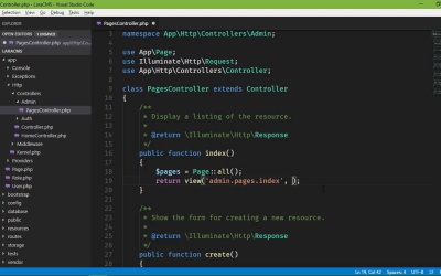 Now we are ready to actually display some information in the browser. But first we need some information to display. So we're going to write a seeder for seeding our pages table. So php artisan make:seeder and we want to call this PagesTableSeeder. So let's hop on over to our code editor. We want to go to the database folder, and then seeds and then the PagesTableSeeder. So here's what we want to do. There is a relationship between the user and the pages that they create. So what we can do is, first of all, get a user, in this case we're just going to use the admin user to create our pages. So we will say user and we will find one with the ID of 1. So we are going to use App\User. We're also going to use App\Page as well to give us easy access there. So we will say admin, and then pages and we're going to save many because we want to create many of these pages, and we are simply going to new, Page and then we will pass in the necessary information. So what do we have? We have the title, this will be the About page, the URI, or the URL, I think we call it. Let's be sure let's go to the migrations, let's look at the create pages. We have title, URL and content, great, so that's going to be fine. And the URL is going to be /about. And then the content is going to be something very simple. This is about us, [LAUGH] for the lack of anything better. So let's just copy this. And we'll use this as a basis for a couple of other things. So we will have an about page, let's have a contact page. So we'll say Contact the URL will be /contact, and then You can contact us. And then one more page. What could this be called, let's just say, another page for the lack of anything else. And the URL will be another-page, and the content will be This is another page. Now we could just run db:seed again, and that would seed everything. But since we don't really want to mess up anything with our existing data, which really it's been seeded before, we're not going to be changing anything. We can run just our pages seeder, but first of all, we do need to truncate this. So we'll say Page::truncate() and there we go. Now let's go ahead and let's add this to our database seeder. Now because we use the users here, we need to run this after PagesTableSeeder. We're adding it here so that if we ever do run db:seed again, then it's going to be ran here. But for our purpose, we're not going to do that. Instead we're going to say db, or I'm sorry, php artisan db:seed, and then we're going to specify class equals, that was PagesTableSeeder. So we'll run that Everything looks good. I guess we ought to make sure that that is the case. So let's open up workbench and we will see if that is the case. Although while that's opening up, let's go ahead and close our seeder because we are going to write some code inside of our pages controller, although that has opened. So let's just take a gander here. And we have laracms, we have pages. Let's select there and we have our three pages. So everything's great, Yay!, we can close that we don't need anything else. So let's open up our pagesController. And what we want to do is retrieve all of our pages. So we'll say pages equals Page:all() that will get all of our pages. But then we want to pass these pages to our view because the view needs to know what data it's going to display. So we do that by passing another argument to our view method. It's going to be an array. The key is whatever we want to refer to our data in our view. So it's essentially the variable that we want to use. In this case, it makes sense to just call it pages, because that's what we are working with. And then we will have our pages as the value, so that's all that we need to do for this method. So now we just need to go to our index.blade.php file, and we need to display that information. So we'll start by taking out our little placeholder data there. And we will add a div with a class container. And then we will have a table with a class of table. I think that's the class that we need to use. And then inside of this table, we will of course, have our data, but let's first of all have our thead, where we will have our headers, and let's start with just the title and the URL. So we'll have a th Title. And let's just copy and paste that and that will be URL, eventually we want to display a little bit more information here, but this is going to be fine. But then we want to iterate over our pages and display a row for each page. So we're going to say @foreach so all of our directives are the same way. @if, @for in our case @foreach and, we have pages as page. And then we end that @endforeach. If we had an if it would be endif, if we had a for, it would be endfor and so on and so forth. So it's very straightforward there. And then we just have our markup. So for each page we'll have a row. The td is going to be the title, now in order to display the actual information we can't just say $page, and then title. We need to wrap that with two pairs of curly braces, that is going to signify to the blade engine that this is data that needs to be evaluated and then, put in that place. So we have the title there, then we will have the URL, and that's gonna be fine. So let's run this php artisan serve. And then I don't have a browser open, so let's fire one up. We want to of course, go to localhost at 8000. And then we look to be logged in, so we will go to admin/pages. And there we have our list of pages. Now let's go ahead and add a link for creating a new page because that's really the next logical step to do. So before our table, let's add an a element with an href, of well, what do we do? Now we could manually say admin/pages/create, but let's do this, Laravel gives us the ability to specify the name of a route and it will generate the URL for us. So here's what we do, we use our pair of curly braces, or at least our double pair of curly braces. We say route and then we specify the route's name. So here's the thing, wheneve