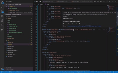 So at the end of the last lesson, we kind of ended on this error here, where it was talking about the style property expecting a mapping from style properties to values, and not a string. So technically, or I guess I should say, typically I don't like to use inline styles. And if I can at all convert those inline styles to using a CSS file or something like that, then I highly recommend doing that. But there are obviously exceptions to the rule and there's times when you're gonna need to be able to use inline styles or depending on the template you're using be able to kinda get around that. And you can absolutely do that and I wanna show you how to do that in this lesson. One of the other things that we're gonna have to look at too, is the fact that in this component, we have a lot of these class references and there's a bit of an issue here. Because when it comes to JSX, there's kind of different conventions that get used. So if I want to use a class attribute on an element inside JSX in my component, I need to use className and not class. So I'm gonna have to convert all of these two className before I really go too far. And usually this is the point where I like to clean all that up. So let's do both of those things. So the first thing that I want to do is, I want to address this inline style right here. Now the problem is, and it kind of goes back and relates a little bit to the class versus className attribute in JSX. JSX kind of is its own breed of kind of HTML or a combination of JavaScript and HTML. And there's different conventions that we use in order to kind of get around all of these things. So as you can see here, this is a fairly simplistic inline style. And what this is saying is that for this particular header, I want to use a style where the background image refers to this image that I have in my image directory called home-bg.HTML, which happens to be right over here, this one right here. So this is the one that I want to use as the background for that. So in order to do that, what I'm gonna need to do is, I need to use kind of the JSX version of this inline style. So I'm gonna drop some code in here so that you can see what that's gonna look like. So I'm gonna paste this in here. So what this is saying is that I want to use the background image property. This is the kind of the React JSX version of specifying the background image CSS inline style that we had in there before. And then from that point, I'm just gonna do basically the same thing where I'm going to specify that this is my property, and the value is gonna be a string here. And this is gonna be a URL, that's the URL function and I wanna generate a URL based on this file right here and this is all being enclosed in double curly brackets. So once I do that, if I were to hit Save, I should come back here. Now you're gonna see that it's going to work. So basically the process is simply for inline styles is I'm going to come in here and I'm gonna use my double curly brackets. I'm gonna specify the JSX keyword or the kind of the name of the inline style that I want to use, in this case, its background image. And then I'm gonna give it the value that I want to pass to it. Now we're actually gonna tweak this a little bit in upcoming lessons because we're gonna reuse this header across multiple pages and multiple components. And this isn't gonna work very well because otherwise it's gonna show the same background every single time and I don't necessarily wanna do that. So then the other thing that I said we're gonna need to do is we're gonna need to change all of these classes here to classNames. So what I want to do here is I'm gonna go into my search and replace, and in here, I'm gonna say class= and I want to replace that with className= and I think that should cover all of it. And let's go ahead and as we can see there's a lot of references, there's 191 references to that. So then at this point I'm gonna click my little button here do I want to replace all those? Yes let's replace all those. So now all of the places where it said class= it now says className= and that's just gonna make the JX and React a little bit happier. So once I've done that I can come over here and everything looks to be doing pretty well so far. So we've been able to come in here and basically take our roots template and get it all jammed into our app component. Now this is pretty bad practice because there's a lot of reusable components in here that I want to start pulling out of here and start kind of making this a little bit more modular. And that's what I'm gonna start doing and showing you how I like to structure things in the next lesson.