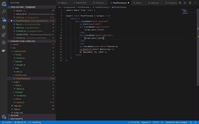 So the next thing that I want to do as I started to allude to in the previous lesson is I want to clean up my homepage a little bit. The problem here is that we have this massive body and it's a lot of repeated information or at least repeated structure, the information might be different. But overall we basically have a div with some information about the actual post itself. We have a title, we have maybe a little teaser and we have some other information here that's being displayed and we want to be able to clean that up because basically this is all the same structure with just different detail and different information in it which always, as I mentioned before, leads me to think about how can I create a component to reuse that information and that's what I wanna do now. So I'm going to start by copying this block right here, since this is basically what's being repeated over and over again, and I want to create a component to house that so I'm going to copy that. And then I'm going to come back over here into my components. And I'm going to create a new folder. And this is going to be my post preview. And I will create a new file called post preview.js. We're gonna import React from React and just as we've done before, we're gonna export const, this is gonna be our post preview function. And we are going to need props for this because there's going to be a decent amount of customization that's gonna go on in all of these, and then we'll simply do a return statement. And we'll drop that code in here like that. So for the most part we could just leave it like this, but everything would be the same all the time and that's not really what we're looking for. So we wanna be able to handle the different pieces of information changing here. So right here we have our title, so what I'm gonna wanna say here, is I'm gonna want to put in my curly brackets so I can add in some data. This is going to be props dot and we're going to call the parent kind of property that's going to pass this data in our post. So I'll say props.post.title. And then down here, we'll say props.post.subtitle like that. And then we have posted by and then this is going to be the author. So we'll change this to be props.post.author and then down here we have the publication date. So we have posted by, the author's name on, and then this is gonna be our customization right here and we will say props.post.publication underscore date, just like that. And then obviously, we're gonna need to change this as well. Because we're gonna wanna go to a specific post or whatever have you and I'm not gonna really fill in a lot of those posts. It's basically gonna be the process of creating a new page and doing all that kinda stuff just like we've done before. So actually right now all I'm going to do is I'm going to change this to be a link, like we were doing before. And then instead of having this href point to nowhere, I'm going to have it say point to I'm just going to have it go back home for now, and it's not going to know what link is. So we're going to have to make this slight change. We're going to have to import link from React router. Done just like we've done before. So now we can save that now this is gonna work. At least it should anyway if I were to create a new post preview component on my page, but there's a reasonable amount of data that I need to pass in, and I need a place to be able to kind of collect all of these. So as you can see, if I were to go back into my home, I've kind of taken care of this part of the equation. But now I need to be able to kind of loop through all of this. In such a way that I can take some data from a source, whether it be from a database, or a web service, or wherever. And now I wanna loop through all of those and pass them into kind of a parent component. So when it comes to creating lists of objects or lists of components, you're usually gonna have that list that you wanna iterate through, and that you wanna pass that data into each of those components. So to have this PostPreview is nice, but I also want to have another component that's going to take a list of all of those components, and then display them appropriately on the page. So that's what I'm gonna do in the next lesson.