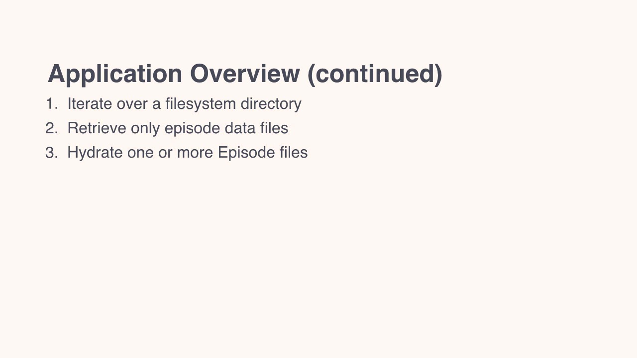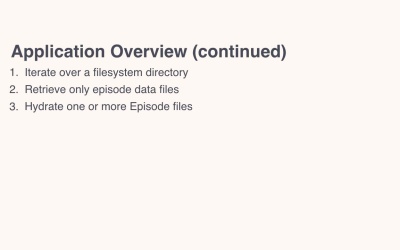 To make the course as practical and as hands on as possible, we're going to build or build on a sample application. One which is based on the clone source repository which is a podcast site. The application isn't too sophisticated. Actually it's a rather stripped down version of my podcast website. Which is Free the Geek.fm. Here's how the application will work. Instead of using a database, which you might typically expect to do so to store and retrieve episode data, the application which we'll create instead uses static text files. These files contain a combination of YAML front matter And a markdown body. Let's have a quick look at a sample file. In this example, you can see that the YAML front matter contained all of the metadata about the episode. Such as the release date, slug, guests, and extract, and the markdown contains all the readable information. Such as show notes, related links, author bio, and so on. To retrieve the files, the application will iterate over a file system directory. Retrieving only the episode files and skipping any anything and everything else which might be contained there. Once it's done that it then hydrates one or more value objects from the information contained in the retrieved files. After the objects are hydrated the data can then be presented to the user in a series of ways. Specifically showing them upcoming and past episodes. This way listeners can get excited about what's coming up, listen to the latest episode, and peruse the back catalogue. Assuming that they're coming in midstream. The code which we'll create will do all of that using only SPL iterators plus some other SPR constructs. Now this might sound simple on the surface of it but quite honestly there is a bit to it. If you start browsing through some of the sample code available in the cloned repository. You'll see that it makes use of a few other libraries, such as Twig. Whilst they're not strictly necessary to create the application. They're helpful to make the process of creating it, much simpler and much more efficient. I just want to digress for a second. I'm the kind of person who believes in not doing more than is necessary. Particularly when it comes to development, and this specifically includes not reinventing the wheel. So wherever possible I make use of existing libraries which provide the functionality which my applications need, instead of doing it myself. And that's it for this video. In the next video, We're going to get a basic introduction to the standard PHP Library.