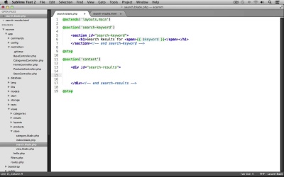 In this lesson we'll wrap up working with our products by building the search functionality and displaying the search results for our search keyword. We'll begin by creating an action that our search form can submit to in our store controller. So let's switch into our text editor and under app controllers, let's open up the store controller. And let's create a new action. We'll create a public function, prefix this with the get HTTP verb. I'll name the action Search. Now we just need a reference to the submitted key word from the search form. I'll create a new variable named keyword. We'll use the input class's get method, and grab that submitted keyword. Now we just need to return a view, so we'll call the view class's make method. This will return a search view file from the store views folder. And I'm just going to chain on a with method call here, so that we can pass all of the products for the search results to the view. This will be stored in a products variable. We'll use our product model. We'll call it where method. And so we're searching for products where the title of the product is like the submitted keyword. Now we need to make sure that this does a partial search. So we're just going to concatenate on a percent sign at the end. And then a percent sign at the beginning, as well. Now, after our where method call, we need to chain on the get method call, to get the results. Now, I'm also going to call the width method again, and we're going to set a keyword variable to be available in the view, and this is just going to be a reference to the submitted keyword from the form, so that we can re-display it in the search keyword section. All right? That's it for our controller. We can save this and close it out. Now let's create our search view file, so under views>store, let's create a new file. I'll save this as search.blade.php. Let's have this use our name layout. So we use @extends('layouts.main') and now our search page has a new section at the top to display the searched keyword. So let's create a new section, I'll name this search-keyword and then we'll stop the section here. Now, let's open up our starting resources folder. And let's open up the search results.html page. If we scroll down to the search keyword section here, we can just copy all of this code. We'll go back into our search view file and let's paste it into the search keyword section. And we'll just fix up the indentation a bit. And now we need to exchange out this keyword for the submitted keyword. We have access to that using the keyword variable. Next let's create our content section. We'll create a new section named content. And then we'll stop the section here. And inside of this section we're going to need a div to hold our search results. This is going to have an ID of search hyphen results, and then we'll end the div here, and I'll put a comment just saying end search results. There we go. And now we can re-use the code from our category page to display the products for the search results. Let's open up under store, category.blade.php. We'll scroll down here. And let's copy from the beginning 4H all the way to the end 4H statement. We'll go back into our search view file and let's paste it into our search results div. There we go. And that's it for our search view file. Now we just need to modify our main layout file to create the search form. And also to add in the yield statement for our search keyword section up here. So under views layouts let's open up main.blade.php. And let's start with updating the search form to use Laravel's form helper. So let's scroll down to our search form div. And let's just get rid of the standard form HTML code. And let's use the form classes open method, we'll pass in an array, we'll set the URL, this will go to store/search and we'll set the method key so that this does a get request. Now we need to create our text input for the user to enter in their keyword. So we'll create a text input using the text method. This will be for the keyword. The value, we'll just set that to null. We'll pass in an array as the third argument. We'll set a placeholder value. This will just say search by keyword. And we'll also give this field a class of search. After that, we need our submit button. We'll use the form classes submit method. This will just say search on the button, then we'll pass in an array as the second argument. And we'll give this button a class of search. And then a space. And then submit so it actually has two different classes and then we just need just to close the form so we use the form classes close method, there we go. And that's it for our search form. Now we need to go down a little further and make sure to yield that search key word section. So right after our promo section we'll use another yield statement. And we'll yield the search hyphen keyword. And that's all we need. We're finished. Let's switch into our browser and take a look. Now I've already got my application up and running, so I'm just going to refresh the page. And here's our search form. So let's try searching for Nexus 10, and great, we get our search key word here in bold saying, Nexus 10. And it looks like we are missing a top horizontal rule here, so let's go into our text editor. And let's go into our search view file. And right above our search keyword section, the section HTML tag, I'm just going to put a horizontal roll in here. We'll save the file. Let's go back into our browser. I'll refresh the page, and there we go. That looks much better. Let's try another search. We'll search for the keyword laptop. And perfect. We get all of the products with the keyword laptop in the title. Next up, we'll work on building our authentication and authorization system to allow users to create a new account, login, and logout.