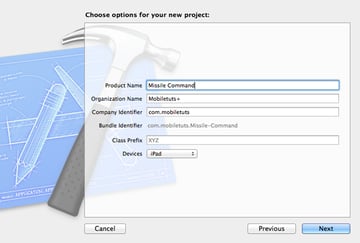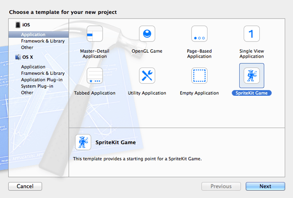 Launch Xcode 5 and create a new SpriteKit project by selecting New > Project... from the File menu. Choose the SpriteKit Game template, name your project Missile Command, and select iPad from the Devices menu.