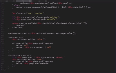In the previous lesson, we created the ability to edit sections within our page, and we haven't seen this in action yet for multiple users. So let me show you how this would work. Let me open up another window here, and I'll load up our dogs page. And right now in the left window I logged in. In the right window I'm not. So in the left window, I can go ahead and make a change to one of our sections. And when I save that change, you can see that pretty much instantaneously the change is made in the right window. So this shows us that if we have multiple users viewing a page at the same time, and one makes a change, all the other users will see that change right away. If we log into our user account here in the second window, I can go ahead and make some changes here. And you can see that these changes are reflected back in the first window on the left. So we have editing working just fine. However at this point, we still don't have any kind of locking mechanism in place. While user two on the right is editing this section, user one could go ahead and edit that section as well, and then we would be in trouble if users don't see their updates. So let's create a locked state for each of our sections. Back in our section.js file, let's look at the getState function that we started with. In the state object that's returned, we're going to add one more property, locked. So a section will be considered locked if a user is logged in and this section has an editor, but the user is not the editor of the section. So we can say props.user and props.section.editor and props.user.username does not equal props.section.editor. That's pretty straightforward. Now we can show that a section is locked by giving it the locked class. And will only show that a section is locked if the user is logged in. So down here where we're assigning classes, I have my if this.props.user block. Right now, we're just pushing in the editable class. However inside that push statement, let's switch to a ternary expression. So say if this.state.locked, then we will include the class locked. Otherwise we'll include the class editable, okay? Now with that class in place, let's switch to our style.css file, and let's add a locked class. So at the bottom here, I'll say .locked. Will Start by setting the border color to a shade of light gray and then will set the background to a darker shade of gray so d1d1d1. All right, so if we save the stylesheet and we refresh the pages, after the pages load, we're currently logged in in both views. So that means if I try and make some changes to a section as one user, the other user will see that section turn gray, which they will know means it's locked. And they shouldn't be able to edit it. We can change a section on the right and the user on the left will find it locked. Now as far as editing via locking goes, we have a bit of a problem. Let's create another section here and I'm going to give this section a link. Now, what's gonna happen if I click this link within the section? Well, I'll go ahead and click that link. Notice that right away the window on the left has the references section locked. Has the references section locked because the other user has clicked it and therefore they have started to edit it. However the link that we click within that element takes over the functionality and user two is actually directed to the new page. So as long as they are away from the website, nobody else can edit that section. If I navigate back to our dogs page, our own wiki here, you can see that that section is still being displayed as a text area. It's still editable by the user two. However, if they had never come back to the wiki, it would be left that way for an indeterminate length of time. Meaning that no one else could edit that section. So we need to fix links so that the user will be able to click links within sections without having to worry about becoming the editor. We'll look at that in the next lesson.