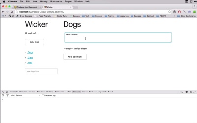 In the previous lesson, we created a section component, so that we could display the individual sections of a page to viewers. Now we want to create the ability for logged in users to edit these individual sections. So in this lesson we'll create the editing capabilities for this section component. We actually start this in the page component. If our section component is to allow a logged in user to edit it, it's going to need to know whether a user is logged in or not. So you probably know exactly what's coming here. We need to give our section a user property. So we'll set the user to be this.props.user. That way our section will know whether or not the user is logged in. Now back in the section.js component, the first thing we want to do is add a property to the object that gets returned from the get state function. And this is going to be the editing property. We need to know whether or not the user is currently editing a given section. So this will be a boolean expression. We can say props.user to see if a user is currently logged in and props.user.username is equal to props.section.editor. So, as we saw in our page.js file, when we create a new section, that section gets an editor, the editor being the current user who created it. Also, when a user clicks on a section, they will become the editor for that section so that they can edit it. So that means that we will have a state property here that will tell us whether or not the current user is editing the current section. So now in our render function we can use this to decide whether we need to render this as HTML or render it as marked down inside of a text box. So underneath our content variable, let's say if this talk state DOT editing. And let me copy the content that we created above our span with the HTML set inside of it and put that in the else block. Because we only want to render that if the user is not editing the page. If they are editing the page we'll set the content to be something else. We'll set it to a text area element. Let's give it a class name of 12 columns so that it takes up the full width of the right hand side of our page. And then we have to give it a default value. That default value will be this.state.content. So this means that when that text area is rendered, the markdown content that is stored in the database will be rendered inside of this text area. So now our render method will render the content as editable markdown or as you will HTML. Depending on whether or not the user is currently editing this section. So how do we flip that bit? How do we set it so that the user can go from viewing to editing? Well let's add an On Click event handler to a root element here our section. When this is clicked, we will call this .startEditing. So let's go ahead and write that function now. Inside start editing, all we have to do is save this.setState and we'll set editing equal to true. However it's not quite that simple. There are a few cases where we don't want to set that state. So we can say if there is no props.user aalue or state.editing is already true, just return. So we're not going to run this function if we don't have a login user, and that makes sense, of course. We don't want to allow them to edit if they're not logged in. Or if they already are editing it, we're not going to reset that state because editing is already equal to true. Now, this is not all that we need to do in this editing function. We need to store in the database the fact that this user is now the editor of this section. Right? Because if any other user anywhere else is viewing this section, they need to know that someone else is editing it, and they are not allowed. So we'll say API., and this reminds me, we don't currently have the API in this file, so let's go ahead an import API as we've done before. And then we can do API.pages.child. And in this case, we need to get a child path that is directly for this section, not just the page does section is in, but for this section content itself. Now currently, our sections have no knowledge of what page they're in. So we don't have the information we need within our section.js file here, to choose the right child reference in the Firebase database. So we're gonna have to add this as a property on our sections element. So for now, we'll just say this.props.path. And we'll go set that in just a second. However what do we want to do when we get our reference? Well, we want to go ahead and update this value in the database. We're going to update this sections editor, property. And we're going to set it to this.props.user.username. So we'll make the current user the current editor of this section. Now before we forget, let's go over to our page.js file. And where we are instantiating our sections, let's add one or more property here, and this is going to be the path. And we'll set path to this.props.params.id. Remember, that is the id of the individual page we are on. And then we'll add '/sections/', and then we'll add the individual sections' id. So if you think about the way we've been using Firebase child references throughout these lessons, you should see that what this gives us, is the root URL to our Firebase data store. /pages, which we get from our API file here on the client, slash everything we've just added here, which is the specific page within the pages. Then the sections property of that specific page, and then the specific section within the sections object. So what we've basically done here is created a reference that starts at our entire database, and we can narrow it right down to the specific key in the database that we want to update. And this is one of the really neat things I think about the way Firebase works. It makes it really easy for you to reach inside your database and update only a single key. If I come back and refresh the browser, I can go ahead and log in and then I can click on one of our sections. And notice what happens. The content converts from HTML