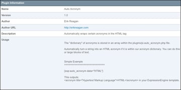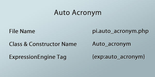 'pi_description' => 'Automatically wraps certain acronyms in the HTML <acronym> tag', |