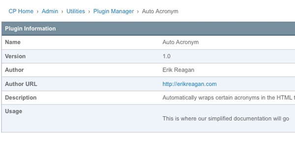 Now we have a fully functioning ExpressionEngine plugin. The final step in completing it is adding in useful "usage" information. Let's go down to the usage() function and add in some simple documentation for the Control Panel.