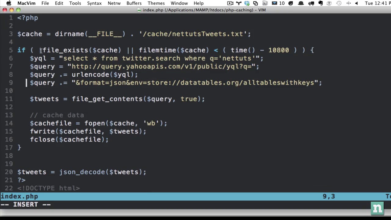 In today’s tutorial, we’re going to mix a handful of technologies. First, we’ll review how to implement a simple form of text file caching with PHP. To illustrate this technique, we’ll use the wonderful YQL to query Twitter’s search API for a list of tweets which contain the string, “nettuts.” Finally, we’ll experiment with PHP’s regular expressions capabilities, and will turn all Twitter usernames and urls into clickable links. Ready…set…