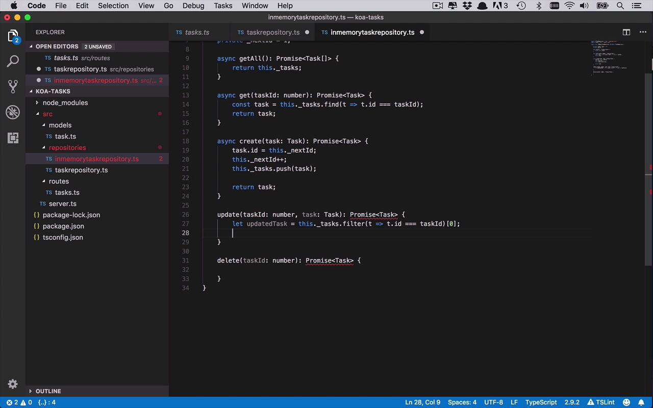 Let's go ahead and finish up our in memory task repository implementation. So we already have our gets now we wanna handle the create, update, and delete. So let's start with the create. Now there's a number of different ways that you can do this. And when I say that, really what I am referring to is the ID that gets associated with the task. Because what we're assuming here is that the consumer of our API is sending in a fully populated task object. But there's really no way for that person to know anything about how the ID is generated, or what the next ID should be, or whatever. So we're not assuming that that consumer has any knowledge about that whatsoever and they're going to have us take care of that, which is really the way that it should be. Now there's a number of different ways you could do this. You could come up with some crazy algorithm to generate unique numbers. You could create unique GUIDs every single time. You could do all sorts of things. I'm gonna keep things really simple. Remember, I made the ID property of the task a number. And that's really what we're gonna do here. So what I'm gonna do is I'm simply going to add another private variable here. And I'm gonna call this _nextId and I'm gonna initialize that to 0. Actually I'm gonna initialize that to 1. So the _nextId that's gonna be used is going to be 1 for whatever's added in to my task list. So the first thing that I'm gonna do is I'm gonna say task.id is gonna be set equal to the _nextId. And then once I do that I wanna make sure that no other tasks get that ID. So I'm gonna make sure that I go ahead and increment that. And then after I've done that I can go ahead and add that to my tasks list by using the push function. And I'm gonna push on that task. And then once I've done that I'm going to go ahead and return this updated task or this newly created task with an ID. And then I have to make sure that I make this method asynchronous. And there you go, it's really just that simple. So now we have our create. Now we wanna handle our update. Now our update here, you can do a number of different ways. You will typically wanna spend some time making sure that the user is passing in a task ID and a task to be updated that actually exists. So you might wanna keep that and to take that into consideration. For this one, we're just going to assume that the user has already pulled down a list of tasks, and has grabbed the one that they wanna update, and is updating it appropriately. So the way that we're gonna handle this is we're gonna say, let updated task be equal to, and we wanna be able to filter on our list. So we wanna be able to go into our tasks and we want to filter and find the appropriate task that has an id equal to the taskId that was passed in. And this filter is actually gonna return a collection. So we wanna make sure that we grab the first ones. So now that we have this updated task, I can update it. So what are the properties that I would update? Well there's really only two. You can really only update name and the isComplete flag. You're really never going to allow a user of your API to update an ID. So what we're gonna do is simply say updatedTask.name is gonna be equal to task.name. And updatedTask.isComplete, is gonna be equal to task.isComplete. So we're updating it to be whatever it was that was passed in to our API. And then at the end of this we're just gonna go ahead and return this updated task so that the user can see exactly what the new version is, and we'll make sure that this is async once again. All right, so that takes care of the create and the update. Let's go ahead and handle the delete. Now remember in this case I kinda made the decision or made the choice to pass back the particular task that's being deleted, just so that the user can see what the current state was before it got deleted. So what we're gonna need to do is, we gonna need to find this particular task that's represented by this ID in our list. We need to find it, we need to remove it. But not only just remove it but pass it back to the end users. So there is couple steps here but it's not too bad. So the first that we're gonna do is we're going to find the index of where this exist within our tasks list. So to do that, we're going to find the index of a task that has a task ID that is equal to the task ID that is being passed in. So that's gonna give us an index of where it lives within that task array. Once we have that, we can go ahead and get it. So we can say this._Tasks, and I want to get whatever task lives at that index. So now I have that. And now I want to remove it from the list. And so in order to do that we're going to use the splice function here. And what splice does is it takes in an index of where you want to start and then how many you want to remove, and I only wanna remove one. So now I have the task that's being removed, and I have removed it from the list. And now I am simply going to return that task. And once again, this needs to be asynchronous. So there we have it. Now we have a basic implementation of an in-memory task repository that implements our ITaskRepository. Now you may be saying, why go through all this trouble? Why do all this? Well we're getting there, we're very close. In the next lesson we're gonna add in one additional layer and that's going to be the service layer. And I'm gonna show you some neat things that you can do with that, and where this ITaskRepository is gonna come in handy when you start to augment your application to be in different environments. Whether it be on your development machine, maybe in a test environment, or even maybe in production. So let's go ahead and see how it can handle that.