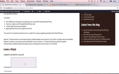 Hello and welcome back to this TutsPlus course on advance theme development with WordPress. In this part of the course, I'm gonna show you how to create multiple include files for your theme. And specifically I'll show you how to create multiple versions of the loop. So let's start by creating a loop for single pages. This loop we've got at the moment runs for any type of content, and it's a bit generic. So I'm gonna create one just for my pages. So I'll close it, and I'm gonna duplicate it. Now that creates a file called loop copy. I'm gonna change that so it's called loop page. So, now I've got my loop-page.php, I can edit it and this will be used by WordPress whenever I display a single page. It won't just yet cuz I'll have to edit my page-template file first. So, I don't want to include the date in my single pages. So I'm gonna take that out and that's about it. I will include the comments template although I'll probably have top comments turned off for pages but in some cases you might want to include comments on pages. So that's my new version of the loop just for pages but doesn't show the date. I'm gonna save that and then I'm gonna open my page template file, page.php. Now at the moment, this has the same function here as in my index file. Get template part includes loop. I wanted to fetch loop page. Now instead of typing what you might expect, which is that, I actually use page as the second parameter in the function. And the reason for that is because WordPress will look for a file called loop-page.php. And if it doesn't find it, it'll open loop.php. So if something goes wrong with my loop page file, if it's deleted or if it's corrupted or something like that, it'll still revert to the loop.php file. So this is the correct way to add multiple versions of the loop using that get template part function. You use a second parameter here. So save that and then let's go to my site, so here we are in static page and as you can see, there is no date there. So this is using that page template with that special loop for the page. Now let's move on and do that for a couple more types of content. So I'll open coder again, I'm gonna close those template files. I'm gonna close loop as well and then I'm gonna do this for archives. So, let's create a loop for the archive. I'll duplicate that, Call it loop-archive and then I'll open it up. Now, here I don't want the comments template. So I don't this entry utility section. And I want to change my heading tag so it's h3 instead of h2. Because there will be an h2 tag around the main archive heading for the page and I'll save that. And in order to activate it, I need to open my archive php file because you see the h2 tag here. And again here I'm gonna write it this so it says archive. And I'll save that. I'll also output what to change here to the exit. Instead of content and I'll save it and then I'll take a look at my site and see how that looks. So here I am on an archive file, archive page for categories. The application category and you can see it's just showing my X out here. For this post, I could create a to make a manual X things a bit neat there. It's showing the date, but it's not showing anything after the excerpt. So that's using that archive loop. Now let's move on to doing that for a single post, so I'll open coder again, I'll close down my files. I'll create copy of loop I'll call it loopsingle.php. Now, this is going to be four single posts or four single posts of a custom post type. Now, let's take a look at that. At the moment, I don't want to change that. That's absolutely fine. And then I'll open my single.php and I'll edit that. Making sure I typed it correctly. And now, I'll save that. Check that that's all correct, and then I'll check it on my site. So here I am back in my archive page for my category. Let's click on one of these posts and here. That was an error with my comments, I need to fix that. There's an error with my comments here, I will fix that shortly. Let's go back a little bit, a different one that's better. Here we go. Right. So you can see the full content of this particular post. So that's my single post. It's got the date, it's got the full content, and it's got the comment matter. And it's got the comments down here. Now, I've worked out what the problem is with this. I'm using a deprecated function. I should be using comment_form instead. I'm going to take a moment to go and correct that in all my loop files. And then I'll come back and check it on my site. So I've now done that, I've gone back and changed it in all of the relevent loop files. And the reason that was the case is because, if you use comments template, you have to include a comments.php file in your theme, with the contents of your template. If you use the comment form function instead, WordPress will pull in its own comments template. And I'm using that because generally for my sites, I actually use additional comment functionality such as JetPack comments, where people can use Facebook or Google to make comments as well. So I don't want to be manually coding my own. So that's that little glitch fixed, now let's go and take a look at the site and check everything's working. So here's my single post on WordPress for writers. And it's got commands, it's got the date, so it's got all the metadata I want. Now, I could add extra metadata. Now, at the moment, our loop single file, our loop here, is exactly the same as our generic group, so let's add something else to make it specific to a single post. And I'm gonna add a list of the categories and tags for this post. So let's start with the categories. So we're using get_the_category_list() which is a function provided by WordPress. And that that has one parameter that we need to use, and that's the separators. So, we're echoing out Posted In and then followed by the output of get_the_category_list, separated by a comma and a space and then a closing paragraph Now let's do the same for the tag