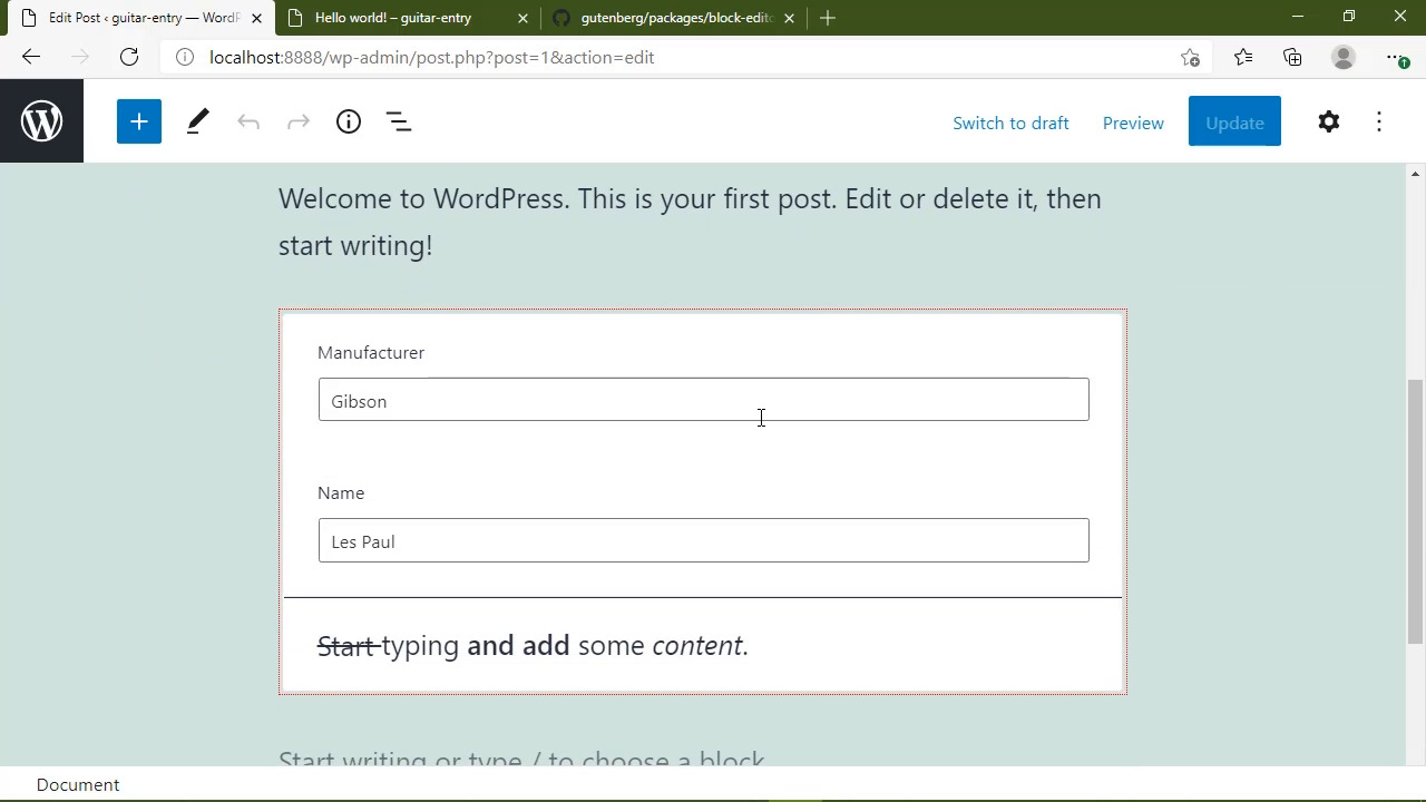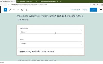 In this lesson, we're going to focus on the look and feel of our block and primarily in the editor. Because when it comes to saving content, well, there's really not a whole lot of stuff that we can do well. There's a whole lot of stuff but nothing that's really worth spending time over, because we can't use any components from the component library. We definitely can't use anything from the block editor library. So what we see whenever we save our content is really just normal react stuff, really, I mean. So, in this case, we're gonna close save and we're gonna focus primarily on the editor. Now, one thing I do want to do is open up a style.css. And let's get rid of the colour of white so that we don't have to strain our eyes in order to see the content. And just by making that change that it's so much easier to see and we will also see that in play in the editor as well, so, that will be nice. However, the next thing I want to do is get rid of this border. Now we can have a border. But I think that there's a better way that we can approach this because there are other components that we can use. That do a better job of grouping everything together. Like for example a card. If you're not familiar with a card, just do a quick search for a bootstrap card. And the minute you see it, you'll know exactly what it is because it is in use everywhere it is a very common thing. There we go, that's a card. So we have the same kind of component. But as I mentioned, it is something that we can't use on the saved side. Although it would be really cool if we could, but we can only use it inside of the editor. Now that's not to say we could write our own card component, and then use that for the saved side. But, once again, that's just normal typical react stuff, so we don't need to dive into that. So let's go to our edit file and we are going to bring in three controls or three components from the component library. The first is card the second is CardBody. And the third is CardDvider. Now if we have a CardBody, then chances are very good that we would have a card header and the card footer and that is indeed the case. But in our case, we just really need these three things. We are going to keep this div element. And we're going to define the card inside of that div element. And we're going to wrap everything else inside of the card. And we will change all of these div elements inside to a card body. So that's just a simple matter of copy replace. So let's do that. And then between the CardBody that has the guitar name. And then our editor or our rich text editor, we're going to add the card divider. And there's one other thing I want to do is changed the placeholder. This is not camelcase that is just all lowercase. And we're just gonna go ahead and denote this using the prop syntax. And we'll use single quotes for the string there. Of course, the quotes don't matter. It's just typically what I use now. So with those changes, let's go back to the editor. Let's refresh the page and we will see something that looks fairly nice or we will encounter an error. So let's look at the console. And let's see what the error is. Sometimes we can tell right off the bat, what the error is. Other times we can't, and usually this error is gonna say that the above error occurred in the Edit. Or if we have something in the save, it might say save, we can see that the card divider is not defined, and that's because I cannot type. So we need to add an eye there. That will make that work. So now let's do another refresh. And we should see something but notice now, well, that's not gonna show us anything. Never mind, so now we can scroll down and this looks a lot nicer. We can see that everything inside of this card is kind of grouped together. So we know that the manufacturer and the name go together. It's also nice that we have the content and if we get rid of the content, we should see the placeholder. So there we go that's great. Now I do want to get rid of this dotted border. So let's go to the editor.css. This is of course, specifically for the editor and we're going to get rid of the border. And we're going to add some style to the card because it's nice that everything is grouped together but the white just kind of stands out to me. So what we're going to do is use some of the colors from the palette of this theme. And unfortunately, there's not really any documentation on that. But if you inspect on any part of this green part or the greenish part and then you start looking at the styles, you're going to see a list of variables, and the styles that we can use. And what I've done, is I've picked out some colors that don't stand out as much as the white in my opinion. So, let's go to the editor. And we are going to do this. We want to style the card itself. So we can do that in a couple of different ways but the best way would be to just use the class name of the card component itself. And you can find that out by going through the source code if you want it to do that or you can just inspect the card. And then, right there, there is our card, components-card, that's the class name that we want to use. So either way, you're going to end up with the correct class name. It's just how you want to go about getting that. So we are going to use our provided a class name, but we're going to style the components dash card. And then we're gonna set the background color to our global Color Purple. We're also going to change the border of the card because it's a lighter color and I would prefer to use something a little bit darker. Or we're going to use is a little too dark for my taste but it is what it is. So we're gonna set just the border color and the color itself is going to be dark gray. Just like that, so with that change alone we can go back to the editor, we will refresh the page. And since we didn't modify anything inside of the block itself, all we did was the CSS. So here's our changed CSS and it still kind of st