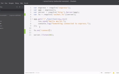 All right, welcome back. Have you been remembering to save your work frequently and update your get repository? I hope so. So now we're going to take our hand at installing socket.IO. So the first thing we're going to do is require Socket.IO. We already installed it in the first video. So here at the bottom we'll create a new variable called io, and we'll make that equal to requiring Socket.IO. But we're actually going to take that and invoke it on server that we defined above. Now I know what you're thinking. There's a lot of variables at the top and they're all interlocking quite a bit. Yes, that's how to get a Socket.IO app to work. There's actually a number of different ways you can go directly with express without http or go directly Socket.IO. This is just the route we chose for this series of videos. Now we're going to listen for something to connect to our io. So we'll say io.on. And we're going to pass it this special string connection. And we'll pass it in a function and the function has a socket argument. Now whenever a Socket.IO thing connects to our application this function will run. So we'll give it a console a log to make sure it worked. And now we'll say socket.emit. Now the socket is the argument that came in in this function. So the first argument is the type of our mission. And we'll just call this messages since this is a message rating app. And the second argument will just be an array and we'll just make a dummy array of simple messages. Pretty simple but it'll work for now I think. All right, so this is working, but we're not going to actually be able to see this code run until something connects to Socket.IO. We'll do that in the next video.