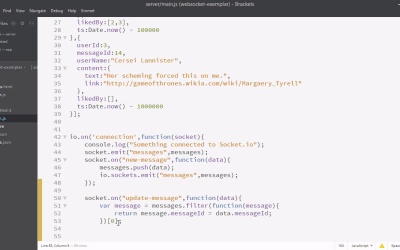 In this video, we're now going to persist the items we like to the back end, using WebSockets. So first, to our add message function, let's add a new field called messageId. And we'll make that equal to invoking our randomId function. Now all our messages will have IDs. So let's go to server/main.js. So the only place we have a reference to our socket is inside the io.on block. So we're actually just going to copy this socket.on for new message. Paste it below and we'll just change this to update message and erase what's inside, so what are we going to do when the updated messages comes? Well, basically, we have our own collection of messages here on the backend. So first, we'll find the message on the backend that is equivalent to the one that's sent in. How? We'll use the message ID field. So, we'll filter through all the messages. And we'll make that equal to the first element of that array, so we just want one thing. So we now have a copy of the message that was sent in from the front end in data. And we have our own copy in message. So let's make our own copy on the back end. Have a liked by, and we'll just copy the liked by property from our new data object. And now that this is updated we need to inform all the other browsers of this. So we'll emit on messages. I'll just copy it from above. Now, let's be sure to restart our server and have a look. Whoops! And we've made one tiny mistake here. Let's see if you can spot it. It's right there. Yes, inside this return statement this should be a double or triple equals. That's one of the tricky things about JavaScript. In another language, we definitely would have received a compile time error when this happened. But luckily we don't receive such an error in JavaScript because writing JavaScript is just too much fun. Okay, here I am with my chrome browser and Firefox browser opened right next to each other. Let's see what happens if I like one of these events. Very cool, so we can now like or dislike items in each browser. You can see it's treating each of those sessions independently and in addition they update instantly. I do recommend you try this out because this is very, very cool. Very nice. So now our app is essentially complete. In the next videos, we're just going to be adding a little bit of style to it and making it look more complete, but if you've gotten this far, you've learned a massive amount of stuff about sockets.io that you can use.