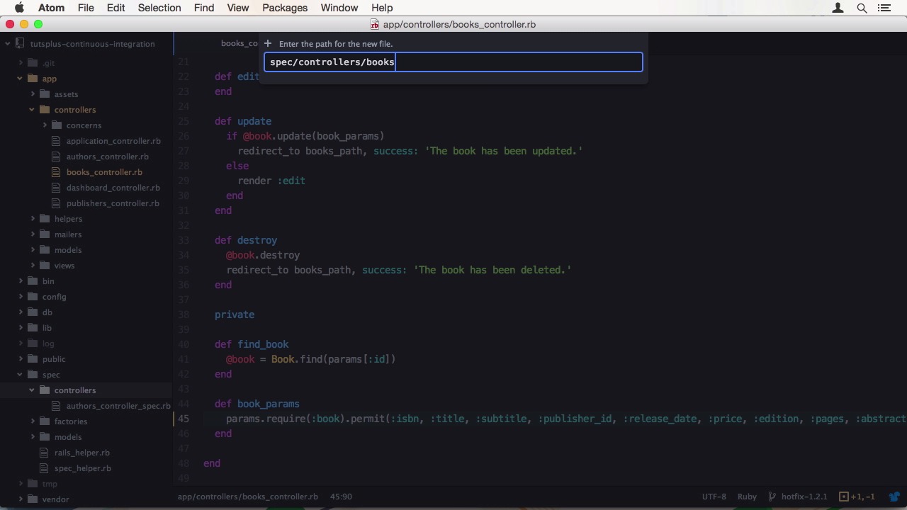 Hi, welcome back to Continuous Integration Workflow. In this lesson we will be releasing our developed feature, and create a hot fix for a reported bug. As you already know, we first need to create a release branch off of our current develop branch. So this is what we are doing now. Let's say our currently released version is 1.1.4, so our next release would be 1.2. This version number will also be used in our branch name. After branching, the first thing you look no ready to win a version application is to update the public version information in your project. It would be best to create a script to bump this information. You might even use the branch name to automatically pull the version from it. Normally doesn't have a version, so we are going to omit that step. I'm also going to push the branch to the server, so Travis CI can run builds on it. Since we are on the release branch, we aren't allowed to add new features, just bug fixes and small cosmetic adjustments. To simulate that, let's say our marketing team found that we shouldn't trust use authors as the title for the listing. We should use all authors. So let's make this change. Hop into the editor and change the H1 tag to all authors. Then commit the changes and push to the server. Let's see what Travis has to say about our commits. It's still running. And when it finishes, all drops are green. Great, this means our feature is ready for release. To finish the release, check out the master branch. Then merge the changes from the release branch with the no fast forward option into master. We are also going to tag this version 1.2 and add an annotation with the release changes. After merging into master is done, we also merge the release branch back into develop using the same options. Then we can delete the branch both locally and on the server. Now the procedure for a hot fix. First, check out the new hot fix branch for version 1.2.1 from master. The work report says that when books are created or edited, the release date doesn't get saved. I have a feeling I know why this is so. When we open after responsible controller and have a look at the book_parans method we can see the release day parameter is missing. Strong parameter's will filtering it out. When fixing a back, and there is no test case covering it, like here, it's important to write test's to cover the change. So before we are going to finish this hotfix, we are going to write some controller tests. Create a new file under spec > controllers called books_controller_spec.rb. Add the rails_helper and the surrounding describe block. We need a test for the create method and check for the release date. I happen to know that a book requires a numeric ISBN and the title. When working with date and time, it is always a good idea to store it in a variable when testing. So time doesn't advance by accident and make your tests fail. Now when we run our tests we can see they are passing. To verify that the test actually tests something, it is a good idea to undo the change and see if it fails. It does, good. The test complains about the missing release date. That is what we wanted. Let's change the code back to the correct behavior. We could also test the update method. To save time we can copy the describe block from create. Since update expects an already present book we have to utilize factory girl to create one. We also need to change a few parameters here. Now when we run the test we see a failure. It seems like factory girl has invalid values. Right, that is non-numeric RSPN. Let's clean the factory up, with meaningful values. Still an error. Let's see. Okay, a copy and paste mistake. We don't want to call post :create, we want to call put :update. Now it works. We can finish our hotfix. To do so, forward the same steps as in the release procedure. Commit your changes. Wait for a branch to have a green build. Merge into master. Tag the release. Merge to develop. Delete the branch. Push master and develop to the server. That is get flow. Now you know how to develop features, create releases, and apply hot fixes. Congratulations. You just improved your development outflow. Even if you only use parts of it. In the next lesson, we're going to deploy our application to Engine Yard. See you there.