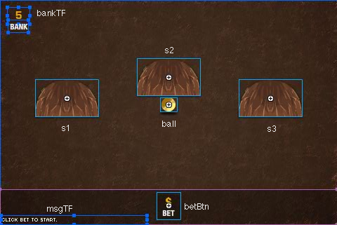 This is the Game Screen, simple shapes are used for the Shells and Ball MovieClips, and Dynamic TextFields for the text elements. You can see the instance names in the image above.