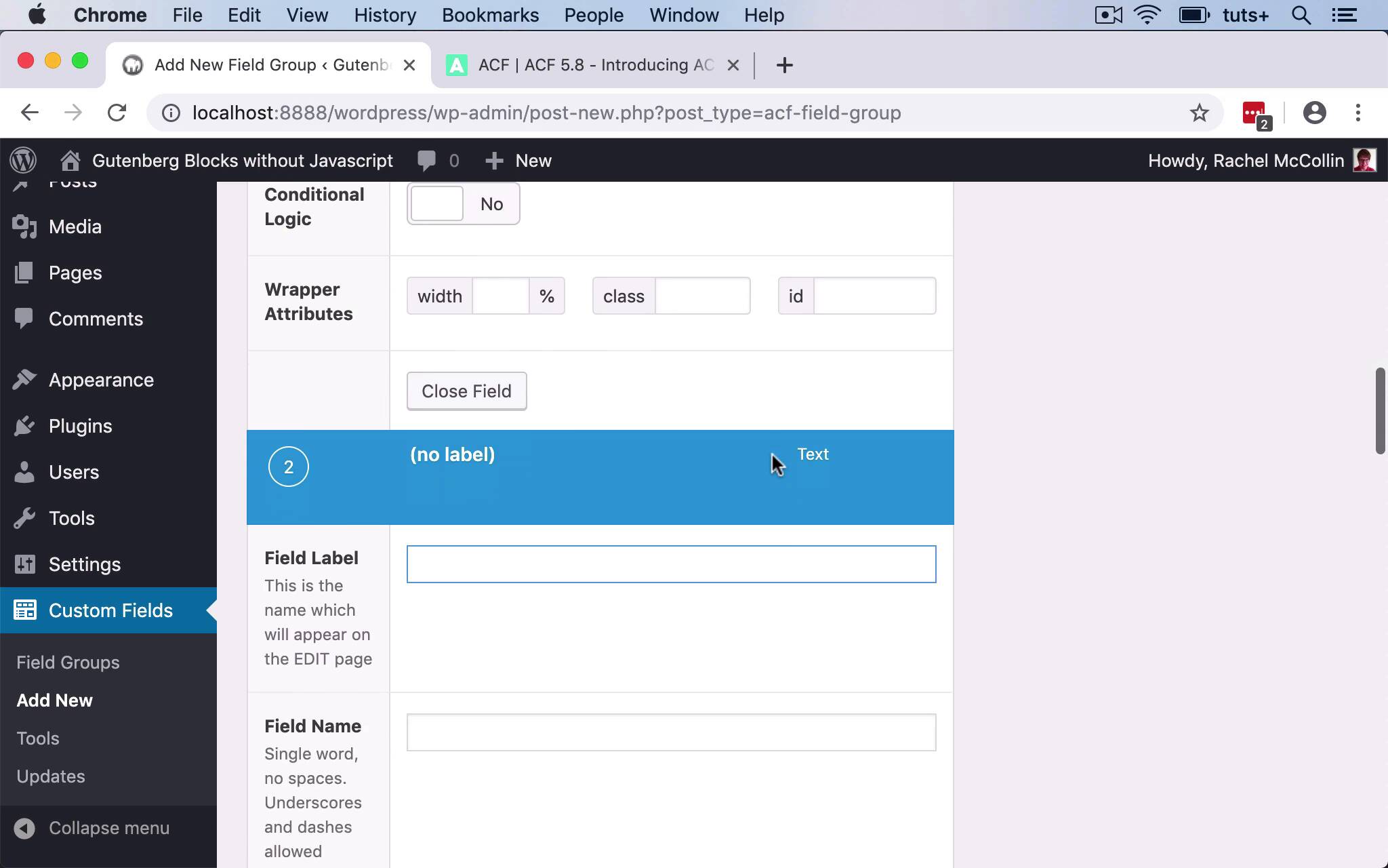 Hello, and welcome back to this test plus course on creating Gutenberg Blocks in WordPress without JavaScript. In this part of the course, we're going to move on to creating a field group for our block. Now, we've already created the block type CTA or Call to Action, but what we need to do is create some individual custom fields now, that we can then use in our posts or pages. So I've not got any field groups yet in my site, so I click Add New to add one. And now I need to add my field group. So I'll start by calling it CTA. Actually now, I'm going to call it something more specific, I'll call it Buy the book CTA. So I'll imagine it's on a website that's about buying books. And now I need to select a location. I could add fields first if I wanted to, but I'm gonna select the location because this is the bit that specifically relates to Gutenberg. So here in locations, we find Block as an option is equal to Call to Action. So that is selecting that Call to Action block that we've already registered in our plugin, and that means this field group will create a block. So now let's add some fields to it. So you may remember when I was setting up the code, I already added to the description, that it had a title, an image, text, and a link. So those, are what I'm gonna add. So I'll start with a label for it and I'll call it Book CTA. And then the field name will be automatically generated for me. The field type for this one is text, I'll add some instructions for people using this block, telling them more what this particular field is. It's not required, so I won't check that. I don't need any additional default or placeholder text, so that's just done. Now I'll add another field. And this second field will be for an image. So I'll call it cta_image and the field type will be image. And again, it will be optional, and I'll add some instructions to it. But adding an image makes our call to action box come to life and not much more arresting on the page. So the preview size at medium is fine for my needs. I'm not gonna limit the media library, and that's good as defaults. So let's add another field, and this will be the text. So we'll call that Body Text and that's a text field type so we can leave that as it is. And again, I'll add some instructions Making sure I type it correctly. This one is required because our call to action box won't be much use without any text in it. And then we'll add another field, which will be the link. And that will be a URL as the field type. Again, I'll type in some instructions for users. And this one is also required because again, there's not a lot of point in the call to action without it actually leading anywhere. So those are all my fields. I don't need to worry about positioning and so forth because it's a block. I don't need to worry about where it goes on the screen because that relates to the classic editor. So I'll publish that to save my field group and then it's added to my site. So I now have the fields in my field group setup. So I've got a title, I've got an image, the text and a link. But what I also need to do is add some settings for styling, and I'm gonna do that in the next part of the course. See you next time, and thanks for watching.
