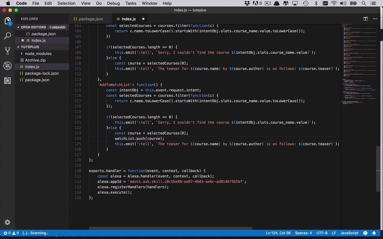 Now that we're able to get a list of our new courses, as well as get a little additional information by getting the teaser for a specific course, now we wanna be able to take a course and add it to a watch list. So that we can be reminded that we were interested in watching this course later on by adding them to a watch list. Now remember, previously we added in this variable empty array of watchList. Now, one thing to note for this is that because this is very simplistic and it's meant to be a very simple example, we're just storing this in this particular instance of our lambda function. Now, if you were to and it's important to remember that this is not being persisted anywhere, we're not writing this to disc, it's not being saved anywhere, except for in this session. So if you were to change this index.js file and reupload, you're gonna lose everything that's being stored in that particular function. So just remember that in a production level environment you're gonna want to store this in a database somewhere. You're gonna want to maybe make a call out to a web service to persist this information somewhere. This is just merely an example, but one so that you can see how you can store information and retrieve it later on in a rather simple fashion. So let's go ahead and create another handler here, and remember, this one is going to be for an operation known as AddToWatchList. So we're gonna create another function, and now we can do all of our operations in here. So we're gonna kind of do something at least relatively similar to what we did before. We're going to go ahead and get our intent object. Then we're gonna set that to this.event.request.intent. So once again I can access that relatively easily, and then from there I want to, once again, find the particular course that I want to be using. So once again I'm going going to use some similar functionality. Now you can obviously take some of this and refactor this out into another function somewhere so that you're not copying and pasting like I'm doing here. But I'll leave that as an exercise for you to be able to enhance this a little bit, and make the code a little bit cleaner. So now we're gonna go ahead and get those selected courses, and once again we're gonna say, if, we're actually gonna copy this, as well. We're gonna have a similar piece of functionality here, and once again, we'll say something relatively similar here. We'll say, sorry, I couldn't find the course, if that wasn't there. But in this case, if it was there, then we're gonna go ahead and get the first one similarly to what we did before for getting the teaser, but we wanna do a couple of operations here. So now I wanna take that course and I wanna save it to our watchList. And then I also want to inform the end user that we were able to save it. So that we were able to put it in the watchList so that you can get the list of courses that are in that watchList later on so you can remember which ones you wanted to pay attention to. So now that we have this course, we're simply gonna go to our watchList and we're going to use the push function, and we're gonna push that course into the watchList. But you might say to yourself, what happens if I continually ask to add the same course to the watchList? Then we're gonna wind up sticking it in there multiple times and doing a bunch of duplications, so maybe we don't wanna do that. So let's be a little bit smarter about this. So now that we have that particular course, I can now say if, and I can go into my watchList, and I say, watchList.indexOf and I can look for the index of that course, so I can try to find it somewhere in there. If it does not exist, then we're going to get an index of typically -1, so it'll be less than 0. So I can say if < 0, then we'll go ahead and add it to our watchList. So that's being a little bit smarter about it, but maybe we wanna do something if it's found somewhere. So if it is found in there, then the indexOf function here is going to return to the indexOf, which is zero based, of where it exists within the watchList. So if that's the case, then I simply will tell the user, using the emit function, I'll say (':tell'). And we'll say, the course ${course.name} by ${course.author) already exists in your watch list. So that way we're just being a little bit more explicit to say why we didn't add it so that the user knows that they've already added this one to the watch list so we're not going to readd it, it's already there. So now we've done this little bit here and that's good, but what happens if we do wind up putting it on there? Then we want to let the end user know that we did add it to the watch list. So let's go ahead and grab this final one here that we copy and pasted before, and we'll just go ahead and add this after, we have added this to the watch list, and we'll just say, The course ${course.name} by ${course.author) has been added to your watch list. Just like that. All right, so it's fairly simplistic, so once again for this particular handler, we're going to get the intent object. We're gonna go through and we're gonna try to find the course that begins with whatever the course name is that the user specified. Once again, remember that's gonna be a list or an array. We're gonna check to see if the length of the selected courses is zero. In that case we did not find any course that matches what was requested so we'll say, sorry, I couldn't find that course. But if we do find something we're gonna use the first one, the first one in the result list, and then we wanna make sure that that course doesn't already exist on the watch list. So we're going to check for the index of that particular course in watchList. And if the index is < 0, like I said, typically negative one, that means it does not yet exist there. So we're going to push it on to the watch list, and then we're going to let the end user know that the course ${course.name} by ${course.author) has been added to y