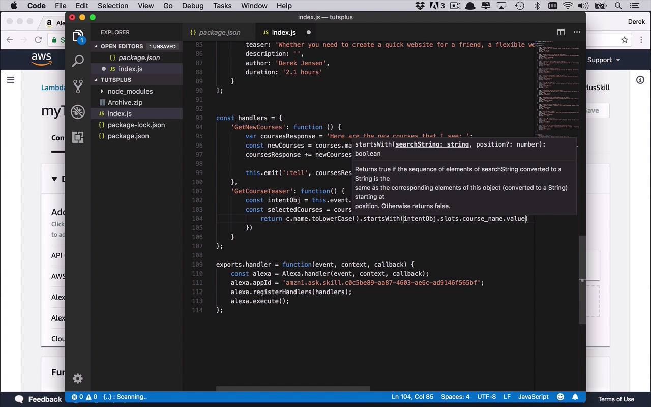 Now that we're able to get the full list of new courses, at least with the name and the author, we might want to be able to get a little bit more information. And so like I said before, we wanna create an intent that's going to get us the teaser of a specific course that we are going to select. Now, the way that we're going to determine this, is we're going to say we want to get the teaser for, and then whatever the course name is. But it could be somewhat complicated to be able to remember the full name of the course. So instead of doing that, we're going to specify some piece of the course name. And then we'll just do the checking based on if that course name begins with the utterance or the slot name that the user uses as the input. And that's kinda how we're gonna dictate this. You can obviously improve that logic a little bit if you want, but that's where we're gonna start and you can take it to the next level if you so choose. If you remember from a couple of lessons ago, we are going to now create a handler for the intent known as GetCourseTeaser. And then once again we're going to specify a function, and then that function is where we're going to give our logic. Now you can do all sorts of different variations of this. I'm gonna give you one implementation and you can feel free to change it and improve it or adopt it to your particular needs. So in this case, I'm gonna start by getting our intent object, so that I can start to pick it apart, and get different pieces of it. So I'm gonna say const intentObj is gonna be equal to and then once again you're going to say this.event.request.intent. So now I have the intent, I can get the name if I wanted, although I'm not really gonna need it, but I am gonna use it to be able to get the slot values like I've done before. So now what I wanna do is I want to kind of search through my list of courses and be able to filter on them based on checking to see if the beginning of the name, or if the name starts with the value that I'm passing in to my course name slot. So the way the way we're gonna do that is we're going to say const and we're gonna actually do this as a list. We're gonna say selectedCourses because of the way that filter works. So we're going to say course selectedCourses = courses. And then we're going to do a filter function. And then within here, we're going to say function(c). And then, we can return whatever courses actually follow or fall into our check here. So I'm going to say return course or c.name. Now remember, we're gonna be only be dealing with the beginning of this, so we're gonna see that the name starts with. But before we can do that, one of the things that we want to be sure of is when the values are being passed from our skill over to our lambda function. Most of them, and actually most in my experiences playing around with this and testing them, these are coming across in lower case. So there's not always uppercase and lowercase, most things are converted to lowercase. So in order to really do this check properly, we're gonna say .toLowerCase. And then we can say, startsWith, and then we can pass in these slot values. So we can say intent, so let's grab our intent object. We can say slots, and then remember what we named our slot and our skill was actually course_name. And then we need to be able to get that value, and once again just to be consistent we're gonna .toLowerCase that one as well. So that way we know that we're comparing against lower cases on both sides. Both what is coming in from our slot and also what is already existing within our courses. So just to kind of cover those bases. So, that's the value that we wanna return. So once again, this filter is going to return a list, so this selected courses can be multiple values, even though in our particular case, I don't believe any of the names actually are similar at the very beginning. So we shouldn't get multiple results here. But what we can do is once we've gotten our selected courses, we can do a little bit of checking and then send back some response to the end users. So in this case, we can say if(selectedCourses.length == 0). So this would mean we've asked for a course or the name of a course that doesn't actually exist. So this filter function didn't match anything, so nothing came back, so maybe we'll just send back a nice little message to the end user. We'll use once again tell and we'll do a little formatting as well. We'll say something like, sorry, I couldn't find the course. And then we'll go ahead and pass in whatever is passed in in that slot name. So we'll say slots.course_name.value, so right there we're going to return back, sorry I couldn't find the course, whatever the user asked for. But now if we did get something then that means we did get at least one result. Now, if we got multiple results we could handle it a little bit differently, but in this case, I'm simply going to use the first one that came back. And then go ahead and get that particular teaser. So we're gonna say const course = selectedCourses, and we'll just grab the first one. And now we have a specific course and now we can go ahead and create our response. So we're gonna do in an emit. Again, we're simply gonna use the tell, and then I'll say, with a little bit of formatting the teaser for, and in this case we'll put in the name. So we'll say course.name by, and we'll add in the author here again, course.author is as follows. And then we'll just go ahead and dump the teaser in here. Say course.teaser just like that. Okay, so now we can review this just a little bit, so we can make sure we're all on the same page. We're going to use the GetCourseTeaser intent. And then once we've done that, we are going to get the intent object. And then we're gonna use a filter to look at the beginning of all of the names in our courses list and see which ones begin with the course name that we're passing in from our skill. And then if the selected courses, because filte