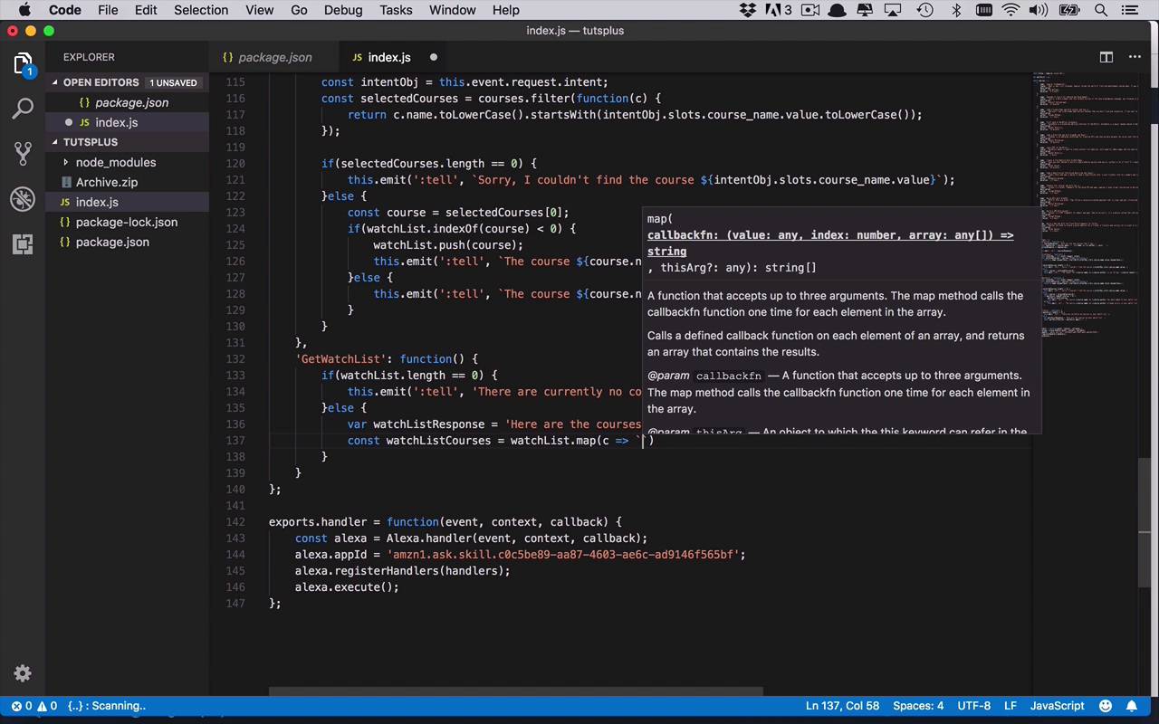 Now it's time to finish up our handlers by adding in the final handler for out intent which is going to allow us to get the watch list. So we can view or listen to all of the courses that have been added to the watch list in this particular session. So in order to do that, we're gonna follow the same process. We're going to add a new handler for the GetWatchList intent. We'll create a function for that. And then this one is gonna be relatively simplistic. So we're gonna go ahead and say if(watchList.length == 0), so in this case, if there's nothing on the watch list, we're going to simply emit a message here. And we're going to tell the end user that There are currently no courses in your watch list. Just like that, so pretty simple. So there's nothing there then we wanna let the end user know, well, that it's empty, and you need to add something to it. Finally, if there are, well, if there is at least one course there and then multiple, we wanna get them on kind of concatonate them together in a similar fashion to how we did the get new courses intent handler. We wanna do something, somewhat similar anyway. And we're gonna start by creating a response, at least a very basic response here. So we'll call this the watchListResponse is going to initially be Here are the courses on your watch list. So that's gonna be the beginning of it. Now we need to go ahead and get all of the courses that are there. So we'll say watchListCourses, this is gonna be equal to, we're going to our watch list, and this time we're gonna use a map function. So we don't really want everything, we just wanna get only a few bits and pieces of information. And typically that's gonna be the name of the course and the author, similar to what we did before. So we're simply going to say, c.name, so the name of that course, by, and then we'll put the author in here again, c.author. And then once we've done that, we are again going to use a join. Because we do wanna use punctuation so that it sounds natural when Alexa is returning it back to us. So we're going to join that with a comma. So now we have this list of all the courses that are on our list. And then we want to add that to our watch list response. So we'll say, watchListResponse += watchListCourses. So we'll concatonate those things together. And we'll simply do an emit, so we can send back a response, tell. And in this case, we're just going to send back the entire watch list response. So pretty simple. We're gonna check to make sure that the watch list length isn't zero. And if it is, we're simply gonna say that there currently are no courses on your watch list. But if there is something there, then we're going to kind of format or build out this response, Here are the courses on your watch list. We will use a map function to be able to get only the pieces of information that we want to use. Now once again, you can add new things in here, add different things in here, maybe add the duration in here. So I did add the duration in here for you. You could use that if you would like. And then once we've got that list of watch list courses, we will append that onto the end of our watchListResponse, and simply send it back to the end user. So at this point you've got four pretty basic intent handlers, GetNewCourses, GetCourseTeaser, AddToWatchList, and GetWatchList. And in the next lesson, we are going to go through the process of doing a little bit of end to end testing. So you can see what it looks like to have full interaction with your skill, with Alexa going back all the way to your lambda function.