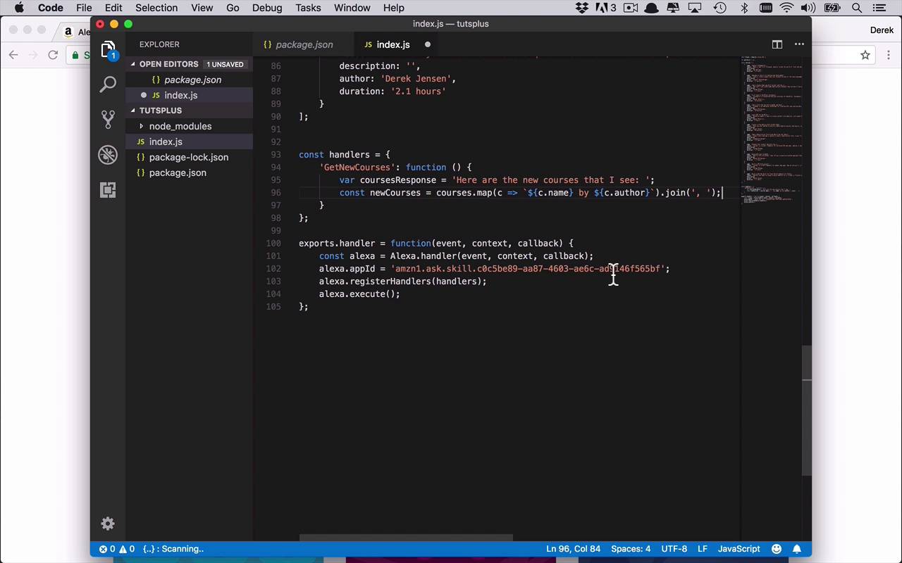 Now that we have our mock data ready to go, let's go ahead and fill out our first handler, the GetNewCourses handler. So we want to modify this a little bit. So the first thing that we wanna do is we want to start by creating kind of the placeholder response that we're gonna end up returning. And then we'll go ahead and get all of the necessary data from our courses list and fill it into that response as we need it. So let's go ahead and create a new variable, and this is going to be the coursesResponse. And we're gonna set that equal to, Here our the new courses that I see. Something like that. And now what we wanna do is we want to dig in to all of those courses and pull out the pieces of information that we want to tell the end user, namely the name of the course, as well as the author. And you could add in additional data if you would like. So we're going to say const newCourses will be equal to courses, and we'll use our map function. And in here, we're gonna say for each course I want to return a little bit of information here, so we'll do some formatting. I want to first return the course name, so I'll say c.name by, and I will also then here return the author, c.author, just like that. And then once I've returned all of those, or once I've gotten all those, I wanna join them all with a comma. Because when Alexa is actually speaking, you will notice that you really do have to pay attention to where you put commas and where you put different punctuation. Because she will use those as pauses, as you and I do in normal speech. So in order to do that, we're simply going to use the join function, and we'll go ahead and join this with a comma space, just like that. So now we have the newCourses put together that I wanna be able to use, and now I wanna add that to my coursesResponse. So I'll simply say coursesResponse, and I'll go ahead and append the new courses onto the end of that. So now I have my response, I've built the response out that I want to return, or that I want Alexa to say, and how do I have her say that? Well, I use the this.emit function that we saw before. So I'll say this.emit, and then we're just going to simply tell, so we're just giving information, and I wanna use the coursesResponse. So we'll go ahead and save that. So that's the basic function of what we wanna do. We're getting the courses, we're putting it together in a nice response with some decent punctuation, and then we're going to have Alexa say it. We're gonna have her tell the end user. So lets go ahead and make sure everything is saved. Now we need to upload everything. So, once again, we'll do, and I'll save you the time and energy, and I'll just go ahead and do this. And I'll come back when we are ready. All right, so now you see I've come back over here to my Lambda function. I have uploaded and saved my code. Now, I will come back over to my test here and I'll once again say, ask tuts to get new courses. And if everything has been done correctly, we should get a fairly lengthy list of all the courses that we've gotten. And as you can see here, we see our response, here are the new courses that I see. Angular Fundamentals by Dan Wellman, and all of the other courses, including their authors listed out here. And once again, Alexa will say this to the end user, and this will kind of be the beginning of the interaction with the end user. So this is pretty nice. Now I can get an entire list, but it is rather lengthy. And what do I do if I wanna know a little bit more about a specific course? Maybe I wanna know a little bit more about Angular Fundamentals. Well, that's where the next handler will come in, where we're going to get the teaser description to get a little bit more information.