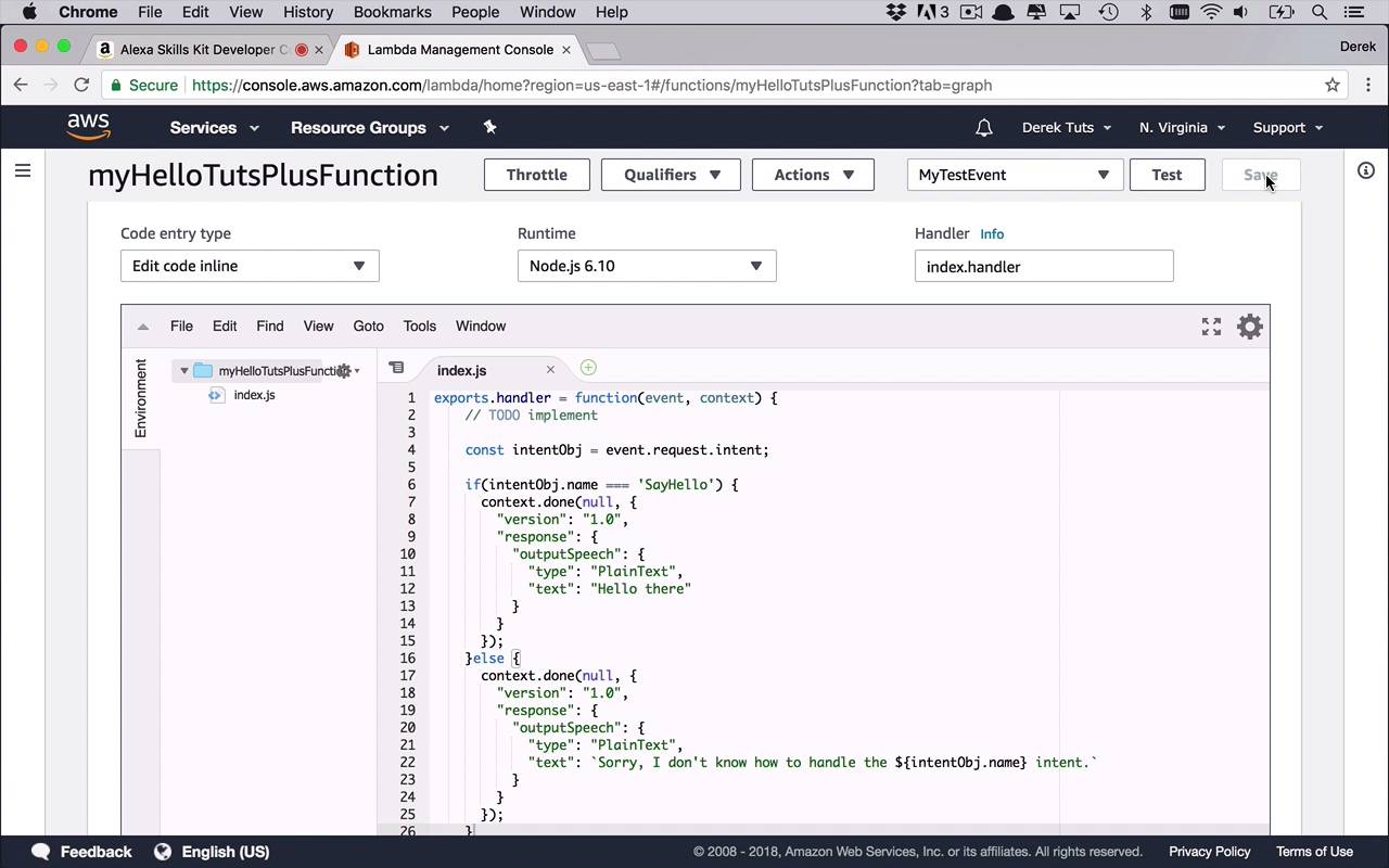 Now I know what you might be saying, at this point, you might be saying, well, Derek, this is pretty cool, I can communicate with Alexa. I can create these intents. I have this really cool Lambda function. And I can get a response from this skill that I've now created and be able to interact with Alexa. But to this point, it's only doing one thing. And it's only responding with this same response every time, with just this Hello there. What if I wanted to add additional intents? And if I were to go back and look at my builder, what about this name here? So I have this concept of a slot in my intent. How do I use that? Well, in this lesson, I'm gonna show you how to be able to extend your skill and your Lambda function, more importantly, to be able to handle additional intents as well as these slots. Now, as we talked before when we were working on this test, we were able to send a request across to our function, and then we could handle that function. And the reason we were able to do that is because the skill is sending over a JSON object over to our function and then our function is handling the response coming back. Well, I can also handle the input coming in as part of that request. And the way that we do that is by accessing some of the properties that are part of this event that's coming across to me. So let's go ahead and see what that looks like. Well, the first thing that you can probably do is you can start to tease things apart here a little bit and be able to take a look at the actual request itself. So what we're gonna do is, we are going to come in here and we're gonna say, const intentObj, or intent, or whatever you wanna call it. We wanna be able to get the actual intent that's coming across, and how do we do that? Well, this is part of the event object, and part of that event object is the request. And once we get that request, we can also dig in and get the intent. Now there's a couple properties on this, but we're gonna start with this one. So the first thing that we wanna do is we wanna be able to take a look and see what the intent is. And in this case, we're really only dealing with one intent and that's the say hello intent from our skill. So at this point, we could say something like, if (intentObj.name ===, and actually at this point, we can start to get really fancy with uppercase and lowercase and all that kind of stuff, but we're gonna keep things pretty simple right now. We're just going to say, SayHello. We're going to check to see if that is our intentObj's name, and if it is, then let's just go ahead and do this right here. And we'll go ahead and cut that, and we'll stick that in here. And then if for some reason it is not that intent, we'll send something else across and we'll just spit out what it says. So we can do something like this. We'll paste this in here, and we can go ahead and do a little bit of formatting here. And we'll say, Sorry, I don't know how to handle the, and then we can go ahead and stick that intent name in here. We can say, intentObj.name, intent ,something like that anyway. Okay, so now, we've got a little bit of customization in here. And now we're checking to see what the intent type is here, and then we can go ahead and deal with that. So let's go ahead and save this. And after we've saved this, we will go back over to our Alexa skill test environment. And let's just go ahead and say, ask hello tuts to say hi. And as you can see, we get this response, Hello there. And the reason we got that is because when it sent the request across, as you can see here, it's sending a request of type IntentRequest. And then down in here, we can see now we have this intent object. And then it has a name property, and it's SayHello. And so, we know that, and so that's what we were using in our Lambda function to be able to take a look at the name of the intent. And that's how we were able to determine it was SayHello. So now we have this little bit of logic going on in here. And now, as you can see, we have this concept of slots. And now I wanna be able to use that. So let's go ahead and pick that out so we can customize this just a little bit. So now we can come in here and if it is SayHello, we can check for a slot. So we can say const slotName is === intentObj.slots.name, is the actual slot itself. And then we now that we have that, we can check a little bit on this as well. We can say if(slotName.value), so we can check to see if something exists there. And if it does, then we can kind of change this up a little bit. So let's go ahead and create a variable up here. We'll say, var greeting, and we're gonna initially set this equal to "Hello there". And so if this does have a value, we can go ahead and modify this a little bit. We'll say, greeting, and we'll append onto there, name that was passed in. And we'll go ahead and format this. And we will pass into this, the slotName.value. So now we're customizing our greetings. So we can say Hello there John, or Derek, or whoever's name that is. And if not, then we're just gonna leave it as Hello there. And then we can modify this text as well to be our greeting. So let's go ahead and save that. So now, as you can see here, we're pulling out this slot, this is the slot we're looking for. And now we have a default greeting. We can say, if(slotName.value), so if it has a value, let's go ahead and use that value, and then we'll go ahead and send through our greeting. So let's come back to our test. And now I can say, ask hello tuts to say hi to Derek, and I'll go ahead and send that through. And now we get some customization, Hello there Derek. And once again, we see that because in our intent, we have slots and this is the name. So if it was called something else like, greeting, then this value, this key would be greeting, and then we would have the additional data down here. And so as you can see, it's coming through just fine and we're able to process that on the Lambda function side. Now this is re