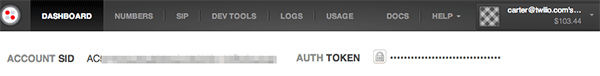 First, you’ll need your Auth Token. Every Twilio account has an Account SID and an Auth Token. They’re kind of like a username and password, but for programmatic API access to your account. If you’re logged-in to the Twilio website you’ll find both of these pieces of information on your dashboard:
