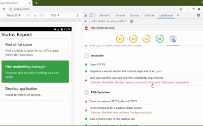 We're going to in this course and much the same way that we began it by running Lighthouse, because we've put in a lot of work, and it's worth seeing how far our application has progressed, at least as far as their grading system is concerned. So let's go to Lighthouse and let's generate that report. Now I know that we are still going to fail some of the tests and some of them are going to be under the installable category. Because ideally there are some things that an application needs in order to be installable. But one thing right off the bat, we actually have something here instead of just a little minus sign. So if we click on that and scroll down, we are fast and reliable, that's great. Installable, here's what I was talking about. Our manifest does not have a PNG icon of at least 192 pixels, manifests display value is not of minimal UI full screen or standalone. Well, here's the thing about being installable. Yes, it's cool that these applications can be installable, but all of the usage data points to that users don't install these applications. Partially, it's due to them not understanding what these applications are, some of them just don't understand that they can be installed. For example, in order to install it on the desktop, you have to go to the menu and actually say, install this application. It's not here, but it is in Brave, and in fact, I forget where exactly it is, but there's many steps that a desktop user has to go through in order to actually install that application. Now mobile is a different thing. But chances are, if people are going to use our application, they are just going to open up the browser themselves, and then navigate to it. And if they're like me, they're just gonna leave the tab open all of the time. So and this kind of goes back to what we talked about with notifications and push notifications. It's a great idea, it's just not used. So don't spend a whole lot of time trying to get your application installed. In fact, probably too many people try that, they want that little icon on the home screen when they should be spending more time making their app work and look better. So, but for the sake of completeness, let's go ahead and let's add some PNG icons to our application and to our manifest, so that we can at least pass that test. So I'm going to add these under vendor. No, I'm not, I'm gonna add these just inside of assets. And these are icons that are freely available, you can distribute them. I did not make them but they are royalty free, they are 100% free, and you can distribute them if you want. So we have these icons, we need to add them to our manifest. So let's go to our manifest. I'm just going to copy and paste these in because there's quite a few there. The idea is that you want many different sizes because different environments will use a different size icon. So it's a good idea to have a wide range of sizes all the way up to 512. So if we go back to Lighthouse, and clear that out, and generate the report again, we should see the icon issue go away, but there's still this concept about the display. And the display just controls how much of the browser Chrome is visible. And we didn't really talk much about that, but this is a perfect time. Now the display value is only used when the application is launched from the icon. So this is only for installed apps and only if the app is launched. It's not for just people who are on the internet, and then access your website through the browser. So once again, this is something that is going to be used by a very small amount of people. And I want to make that point because minimal UI gives you a minimum amount of UI elements from the browser Chrome. So there will probably be a back and forward button refresh, you might be able to view the URL. But if you go beyond that to full screen or standalone, then you're going to lose a lot of the built-in functionality. And you have to provide that functionality, because users are accustomed to navigating websites and web applications. All right, they've had a lot of years of practice. So if you do intend on going to full screen or standalone, well then you're going to have to put in all of the extra work to make sure that the users experience is what they expect. Now in our particular case, we don't need it, but I'm gonna go ahead and put the display value inside of our manifest file, because, well, I'm a completest. So we're gonna have display, and I'm just gonna set this to minimum-ui or minimal-ui, because I don't want to have to replicate all of that functionality. So if we were to run this again, then the installable will all be green. So we could scroll on down to this PWA Optimized, if we wanted to provide a background color, we could go ahead and do that. So I guess, why not? So let's go ahead and add that. And we have that theme color, I guess we could do the same value there. So why not? Let's go ahead and do that because that way we will have that set. And then there's this apple, specific one apple-touch-icon. And the great thing about this is if you drill down into them, there's always this Learn More link,.so you can find out what exactly it is that you need to implement. So here's the apple-touch-icon. We can see that we would need to add a link element to our index page. So we can do that, the REL needs to be apple-touch-icon. And then of course, the Href needs to point to, does it give us the size that it needs to be? I think it does instead of Lighthouse, it's 192 or 180. Okay, so let's open up index.html, and we will add that link element. And we'll change the Href to one of our icons, so that was inside of assets and icons. And let's see what we have here. We need a 192 or 180, we don't have one, but that's okay. Let's use the 128, so we'll have icon -128.png, and we will run Lighthouse again. Let's generate that report and we will see. We'll still probably fail that one-apple-icon, but at this point in time, I said I'm not complet