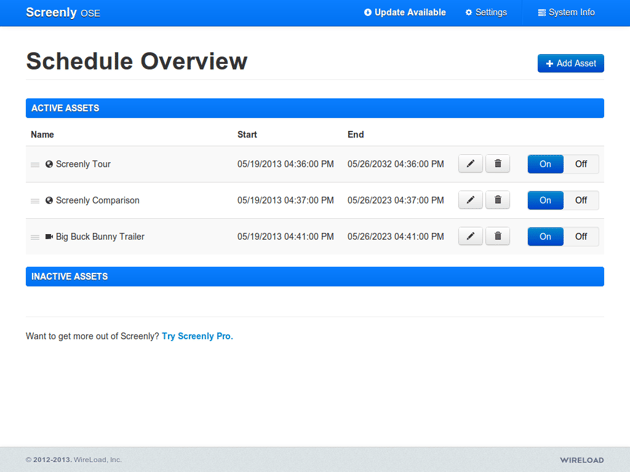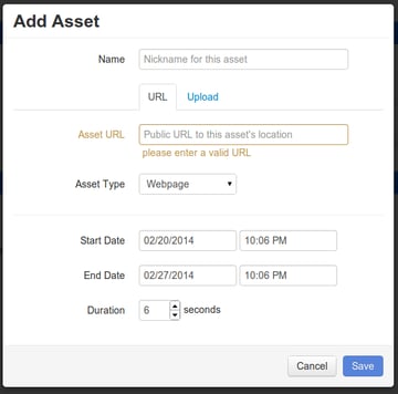 Assets are the individual pieces of content that are placed into the schedule. Assets can be images, videos or web pages.
