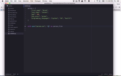 We've gone through a lot of cool things in this course so far. We've been dealing with files and how to handle reading and writing and moving around in files and saving things here, and writing things there. And how we can work with collections and lists, and modify these collections and lists, and order them and pick things out and do all sorts of crazy things like that. Now I wanna start to bring those two worlds together just a little bit. So let's give a somewhat real world example here, where I would like to take some information, some important information about maybe like a person or something like that. And I wanna be able to write that to a file, I wanna be able to save that to a file. Maybe for reporting purposes or maybe just to save it somewhere, so that I can retrieve it later and do some sort of processing or whatever it is I need to do. But ultimately, it's time to start working with a little bit more interesting data than maybe just numbers or strings in a file or sentences or something like that. Let's get a little bit more down to the nitty gritty. Let's say, I'm dealing with a system where I need to keep track of personal information about some people, maybe multiple people maybe a single person or whatever have you. It doesn't really matter, but the point is I need to get that information and I need to save it. I need to persist it somewhere, and in this case we're gonna persist it to a file. So let's start off with creating a simple person. So I'm gonna create a dictionary here and it's going to be person. Now this is gonna contain some information and it's about this person. Now you could define any number of properties about this person that you want, but I'm gonna keep things rather simple. But feel free to expand upon it however you would like. So we're gonna start off with a first_name and this person's first_name is going to be Derek, and this person's last_name is going to be Jensen. And this person's age is going to be 100, and maybe this person's eye_color is going to be green or whatever you like. And you can continue to add properties on here they could be strings if we list so you could you know do whatever you want. Maybe you could add it here, programming languages. Maybe you wanna keep track of this person's proficient programming_languages and it could be things like Python, C#, maybe Swift. A whole a whole slew of different things and now I have this object and you can have several of these objects, you can have a lot of different people. You could be creating a census of different people in your organization and their skill sets and all sorts of things like that. And I'll have all that new information and I wanna persist I wanna save it. Well you could save it to a database, but in the vein of what we've been trying to work on here, we've been working with files and we've been talking about different ways to access files reading and writing and things like that. And everything that we've done to this point we have been reading in writing from files in a very ASCII sort of way. So the text that's in those files is the text that's there. Those are the strings, the raw strings that we've been dealing with, but there's another way that we can read and write data to files and that's in more of a binary format. So I'm able to write things a little bit differently to files, and this comes in very helpful when you're dealing with objects. Or when you're trying to, what's known as serialized data to a file somehow so that you can retrieve it later on in its exact format. And which tends to be a problem where I'm dealing with a complex type here. I'm dealing with a dictionary that's got some strings, it's got some integers, it's got a list and how do I manage that data? How do I persist that data and persist its structure and then retrieve it back out later? That could be some very complex logic I would have to build, but thankfully for us with in Python there is using some things we've already learned about accessing files and bring in a little bit of a library to help us where that's really gonna make this entire process much much easier. So I have this person and I want to write this person to a file, wanna serialized this object and save it to a file. Well like we've talked about before, let's go ahead open a file, let's say open and we'll just call this person for now and we can call this whatever we will. Let's just call a person .ser. You could give it whatever extension you would want, doesn't really matter. And then we're gonna give it some sort of access, we're gonna call this as person_file, and that's the start of it, so let's talk about a couple things that are going to change here. I do wanna write to this file, I wanna write my person to this file. So we are going to use write access, but we're going to use a slightly different write access. So far we've talked about raw write and write plus. This time I wanna do a binary write. So that B is going to say I want to write this in a binary format. So there's gonna be some extra things going on in there behind the scenes that I'll show you in just a few moments. Now it's a little bit more than just being able to do that. There's a little bit extra that has to go into all of this. You have to be able to format this person object in such a way that it's going to be easy to write to the file and luckily for us there is a little bit of a trick here, a little bit of a library called pickle. I know it's an interesting name, but it's incredibly powerful and very useful. So we're going to import that into our script here. And within our with statement now that we have this open for binary writing, we were referring to this as a person_file. Now, I want to use pickle I want to use the dump function on pickle. And I need to specify what it is I want to dump, which is gonna be my personal object. Remember this could be a dictionary, it could be a string, it could be a list of dictionaries or a dictionary of l