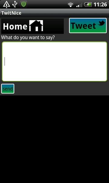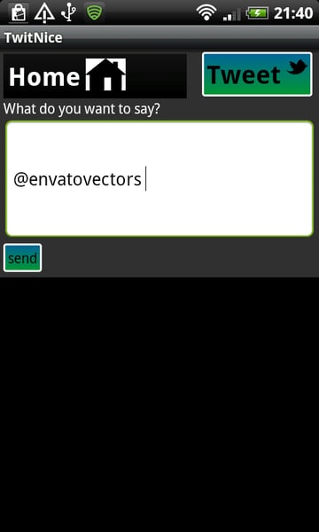 Wenn der Benutzer die Tweet-Taste drückt, wird ihm ein leeres Textfeld zur Eingabe seines Tweets angezeigt. Zum Senden wird eine Schaltfläche zum Senden verwendet.