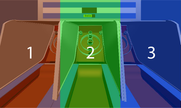 The alley bowlers are the main components of the game's scene. The player will use the touch screen to throw a ball, aiming for one of the holes.