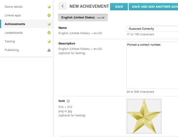 Antes de continuar, es posible que desees consultar la página de logros en la Guía del Desarrollador para asegurarte de comprender el concepto de logro en Google Play Games. Ingresa un nombre, una descripción y un ícono para yu logro y elige un estado, puntos y un orden de la lista. Para nuestro juego de ejemplo, usamos Adivinado correctamente como nombre, Escogido un número correcto como la descripción, y una imagen de estrella simple como el ícono. Haz clic en Guardar para guardar el logro.