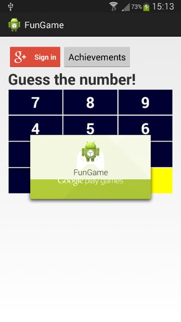 Usamos el método getAchievementsIntent con un número entero arbitrario para mostrar los logros del usuario dentro del juego. Al presionar el botón Atrás, el jugador volverá al juego. Para obtener más información sobre los métodos de logros, consulta la página Logros en Android en la Guía del desarrollador.