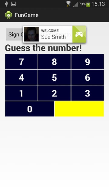 Ten en cuenta que también incluimos un botón de Logros junto a los botones para iniciar y cerrar sesión. Implementaremos ese botón más tarde. No vamos a entrar en demasiados detalles sobre el juego de muestra, si ya has completado incluso aplicaciones simples, esto no debería ser demasiado difícil.