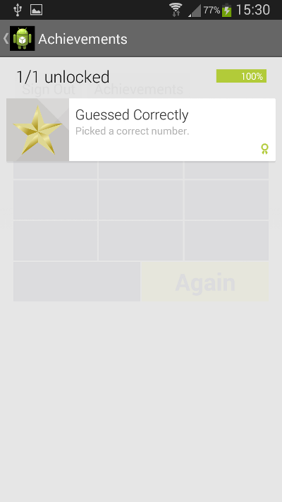 Puedes agregar más código a estos si es necesario. También puedes optar por guardar el progreso del jugador, incluso si no han iniciado sesión, pero esto depende de tu juego. En la aplicación de muestra, tomamos el enfoque simple de verificar que tenemos una conexión con los Servicios de Google antes de intentar trabajar con el logro.