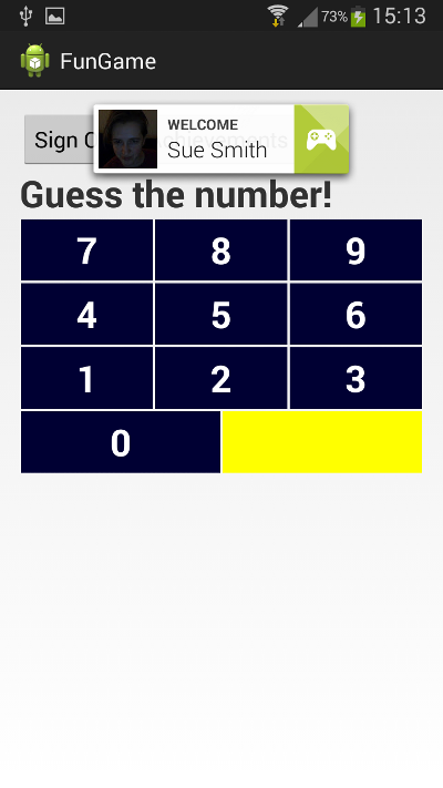 Usamos métodos de la clase BaseGameActivity que estamos ampliando para manejar el inicio de sesión (beginUserInitiatedSignIn y signOut), actualizando la interfaz de usuario en consecuencia. Cuando se inicia la aplicación, intentará iniciar sesión automáticamente en el usuario, pero también podrán usar los botones para iniciar o cerrar sesión.