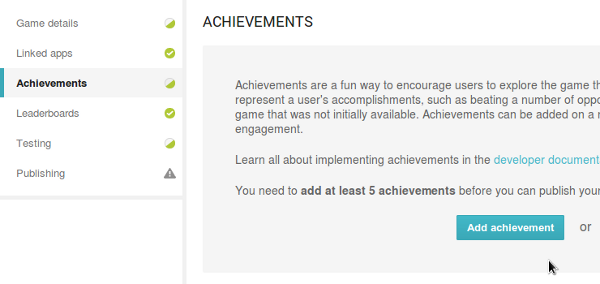 Aún en Developer Console, haz clic en el botón Achievements a la izquierda de la lista de juegos y haz clic en Agregar logro.