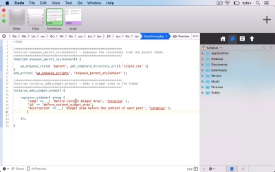 Hello, and welcome back to this Tuts+ course on WordPress widgets. In this part of the course, we're gonna create a new widget area for our theme. So I'll show you how you do that using this function, register sidebar. And you'll see this is one of those examples where the word sidebar is being used to refer to a widget area. So the widget area that you register doesn't have to be in the sidebar. It can be absolutely anywhere on the page, but the function is called register sidebar. So this theme has already got quite a lot of widgets, but I'm gonna add two more. I'm gonna add one above the content and one below the content, those will go above or below the content as you might expect. Now I find that quite a useful place to add a widget. Because I can add something like a call to action button, or a box with more information, or maybe a list of recent posts or something like that. So I'm gonna show you how to add those. Now the first thing we're gonna do is create a child theme for this theme. Because this is a third party theme that I downloaded from the theme directory, and you should never directly edit a third party theme. The reason being that when you update the theme, all the changes you made will be lost. So instead of that, I've created a child theme. So here's the style sheet for my child theme, and it's got the this Tuts+ widget areas, is its name. And you can see here it's got template as colornews, and that's the theme that I'm using on my site. And in my functions file, I've already got this function here in queuing the parent style sheet, which is the best way to set up a child theme in WordPress. You shouldn't be using a call to the parent theme in your style sheet. Instead, you should be enqueueing it properly in your functions file. So that's the child theme setup. The next step is to activate that child theme on my site. So I'll go to Themes, and then this is my theme. So I'll activate that, and then I'll go back to my widget screen, and go back into the code. So I'm now gonna add a function to register the widget area, or widget areas. So my function is going to be called tutsplus_add_widget_areas. So here I use the register sidebar function. So in my register sidebar function, I have an array of parameters. So let's add those. So the first three parameters there are the name of the sidebar, which is internationalized, the id of the sidebar or the widget area, and then the description. And the name and the description we'll see in the widget screen and in the customizer, the id we'll be using when we add it to the theme. So this HTML will go before each widget that's placed in this widget area. And in fact, I'm gonna change this class here just to widget. So we know that that is a widget, and this is a widget area. So these parameters here are the HTML that's output before and after the widget. So we've got an ID which is the ID of the widget itself, which will be provided by the widget code. And we've got a class which is widget. I change that from widget container just to make it a bit clearer. And the second class is the ID of that widget itself. So we can use those to target for styling after the widget closing that div, and then the title is wrapped in an h3 with the class of widget title. So I'll save that, but what I also need to do is attach that to an action hook. And the action hook we use is widgets_init. And I'm going to copy and paste my function. So that's my Before_Content_Widget_Area. I also want to add a widget area for after the content. So what I'm gonna do here is copy this and then edit it. So I now have my two sidebars being registered. And also because I'm using internationalization here, I need to add a text domain to my child theme, Making sure I typed that correctly. So now if I go back to my widget screen, and I've refreshed this, you can see I've got two new widget areas. Now right now, these widget areas are available in my widget screen, and I can add widgets to them, but they won't actually output anything in my theme. And that's what we'll fix in the next part of the course. So we'll create a function that adds the content of those widget areas to the right place in the theme. See you next time and thanks for watching.