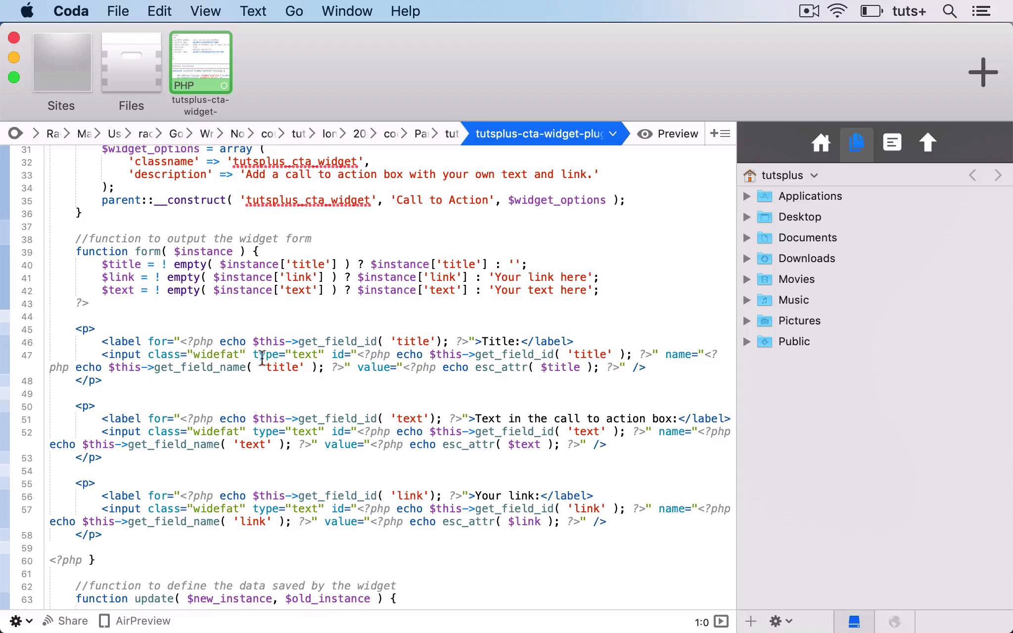 Hello, and welcome back to this Tuts+ course on WordPress widgets. In this part of the course, I'm gonna run through the code for a widget plugin for you so that you can see exactly how they're created. Now, I'm gonna use a widget plugin that I already created for this course, £ Practical Projects to Learn to Code WordPress Plugins. Try saying that fast. And this plugin is a widget that adds a call to action widget. So it's a plugin adds a call to action widget to our site. So you can see I've activated it here on my site. And then if I go to my Widgets screen, The call to action widget is available to me, so I can add it to the right sidebar. So I've added some text in the Call to action box, and I've added a dummy link there. So if I save that, which is already saved, and I look at it in my screen, you can see we have a box here, Drop us a line to find out more. So that is a link which I can click on. And it's shown up just in a widget box at the moment. And there is some styling that adds the colors, for example, in the plugin. But you could edit that and make it work exactly how you want to. So to fit with this theme, we might add some red and black, for example, to it. But what I'm going to do now is work through the code, and walk you through that code so you can see how it works. So here is the file for our widget plugin. So you can see it's called Call to Action Widget. I've got the information up here, and then I've got enqueueing the stylesheet for the widget, because there is a style.css file within the plugin. And then I've got the actual widget itself. So here we've got a class, tutsplus_Cta_widget, which extends the WP_Widget class. So we've got our own new unique class. But that references that WP_Widget class, and uses that from the Widgets API in WordPress. And we start with the widget constructor function. So this is always laid out in the same way function __construct(). And then I have an array of variables for my widget options. So I've got a class name for it, and a description. And that is within the code, bit like when we register a widget area. And this description is shown in the Widget Screen or the Customizer. So you can see here it says add a call to action box with your own text and link. And then we use this parent::__construct() function with the class name, a name for our widget, and then these widget options as the parameters. So that's the constructor function. We then have a function to output the widget form. So that is this form here in the Widgets screen, or alternatively, there's a form within the Customizer if you add it that way. So we've got three variables, the title, the link, and the text. Title, text, and link. They don't have to be the same way up. And so I've got three paragraph elements, each of which has a label and an input. And you can see the label and the input here. So I've got my label for my title field, and I'm outputting the word title. And then this code here is how I set up my input class. And I'm looking for a field using get_field_id. And that is referring to this field, the input field that we're in in our form. So then we repeat that for the text field. And again, you can see I've got different text here, a different label, and again, for the link. So this shows up text in the call to action box and your link. So that outputs the form in the Widgets Screen or the Customizer, so that's the second part. The third part is to update it. This update function is what will save anything I type in here to the database, so that it can be output in the site. Because if it's not stored in the database, it's not gonna be shown anywhere. So I have $new_instance and $old_instance, and $new_instance will be overwriting $old_instance if I've added something new in the Widgets Screen. So to start off, $instance is $old_instance, and then $instance then becomes $new_instance if anything's been added for any of those variables, and then we return $instance. So if there isn't a $new_instance, it stays as $old_instance. And then it will save that. We then have the widget function, which is what actually outputs it in the screen. So we're using the widget title, the text, and the link. And then we're outputting the before_widget arguments, which you'll remember are part of registering the widget area itself. And then we've got a div with the class of cta. So we can then target that in our stylesheet, and style that call to action, and turn into a button if we want to. And then if the title isn't empty, we're echoing out the actual text of the title. And it would actually be good practice to put that within h3 tags as well. And then we're echoing out a link, so an A element with href being that link variable. So we're echoing out the title, the link, and then text inside that link. Closing that div, the cta div, and then echoing out the after_widget arguments, which is part of the registering_widget area that we already looked at. So those are my four functions which make part of that WP_Widget class, or rather not the WP_Widget class, the tutsplus_Cta_Widget class that extends WP_Widget class. So I've created that, but that won't actually do anything unless I register the widget. So I then have my function tutsplus_register_cta_widget, within which I use the register_widget function to register this function here, which is the class I already used. And then I hook this function to the action hook, widgets_init. So those are the five elements of creating a widget. And here I've created a widget that mainly consists of text. Now you could create a variety of different types of widget. So I'm now going to show you another example. In the next part of the course, I'm gonna show you another example of a widget plugin. And that widget plugin will register a post type, and then query that custom post type, and output it in a widget. See you next time, and thanks for watching.