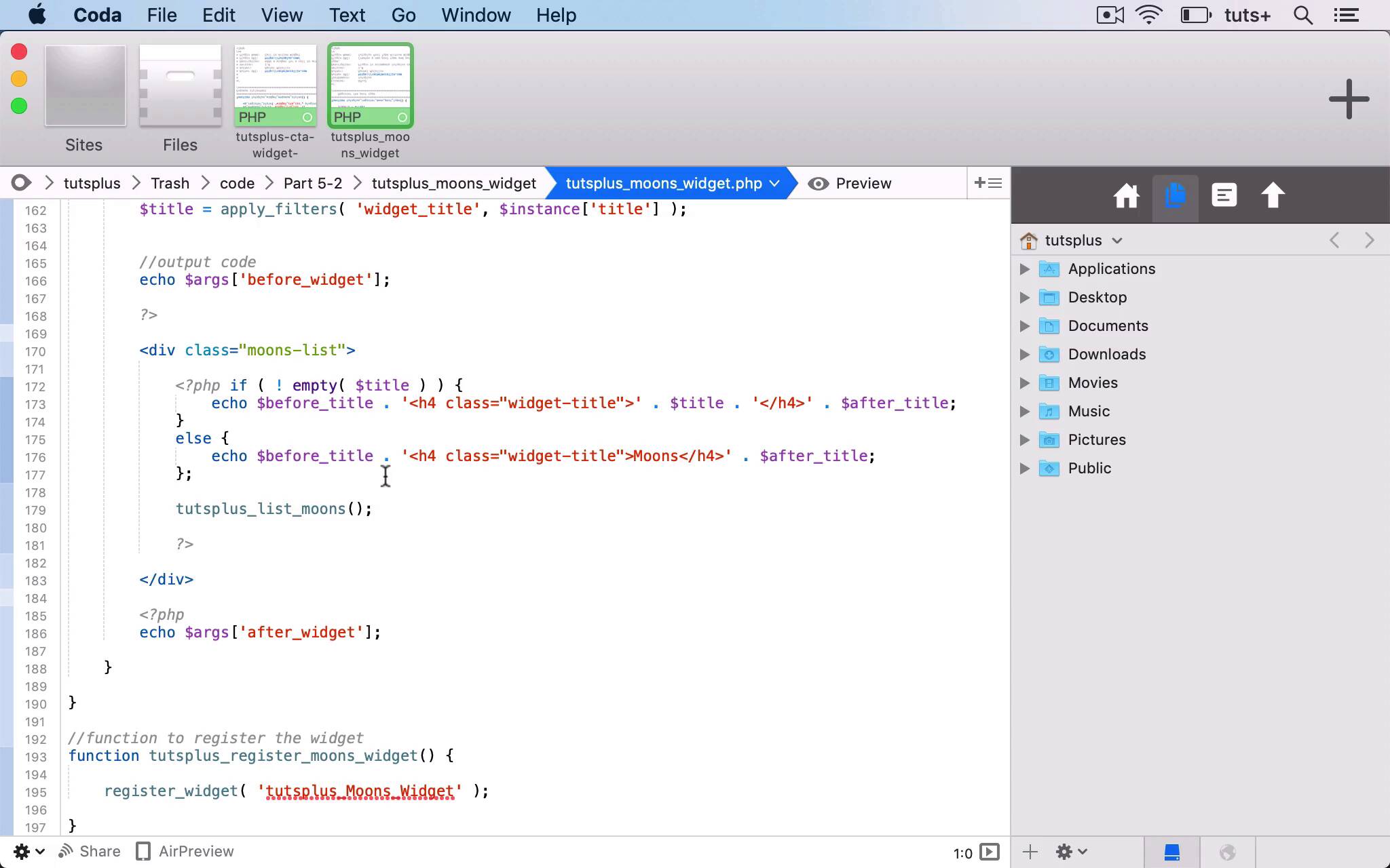 Hello, and welcome back to this tutsplus course on WordPress Widgets. In this part of the course, I'm gonna run through the code for a widget plugin for you. And this is a widget that outputs the latest posts using a custom post type. So first, my plugin registers the custom post type. So I've got this Moon's post type that's been registered. There's also a taxonomy being registered for it, which is a planet taxonomy. And then I'm gonna be outputting a query in my widget. So, here I've got a function called tutsplus_list_moons, which uses the WP query class to output the most recent five moons that have been added to the site. So this uses a query with an unordered list of all the moons. So, that's quite a simple query. And then we have our widget. So, we have tutsplus_Moons_Widget as the class. We have a widget constructor function, which is very similar to the previous example I showed you, a form which is much simpler this time because all we need is a title. There aren't any other variables or text. We've got a label for the title. We've then got updating, which is just with the title. And then we've got a function to output the widget, which is a little bit different. So firstly, we've got the title, where we're using the instance of title in our widget and hooking that to the widget title filter, which is used when outputting a widget. We're echoing out the before widget arguments. If the title variable isn't empty, so the title has been set, in other words, echoing out before the title and then an h4 class=widget-title, and then the title itself and then closing our h4 and echoing out what comes after the title. If that's not the case, we've got a default title here, so I'm just calling it moons if the user hasn't added another title. And then, instead of outputting a lot more HTML or PHP, I'm just running this tutsplus list moons function. So that goes back to up here this tutsplus_list_moons function, which runs a query using WP_query, querying our moons post type. So that particular widget will register a post type and add a widget to my site where I can display the most recent five posts from that post type. And obviously, finally, I have the tutsplus_register_moons_widget function. I'm registering that widget using my class name here, tutsplus_Moons_Widget, and I'm hooking that to the widgets_init action hook. So that's a second example of a widget. And this one does a different job, instead of outputting some texts that the user imports. In the widget screen on the customizer, it outputs a list of a custom post type and it registers that custom post type as well, because obviously, you can't output it unless you register the post type. So that's a second example of a widget plugin. In the next part of the course, we're gonna wrap up, and I'll walk you through everything we've covered during the course and what you've learned. And if you want to learn more about the details of creating these two widgets, you can check out the courses for each of them. So we've got introduction to WordPress plugin development, and three practical projects to learn to code WordPress plugins. And those two courses, we'll work through that code in detail. Because as you've seen, it's quite complex code, and it will show you exactly how to create your widget plugins as well as other types of plugins too. In the next part of the course, we're going to wrap up and I'll work through what you've learned as you've been going through this course and conclude the course. See you next time and thanks for watching.