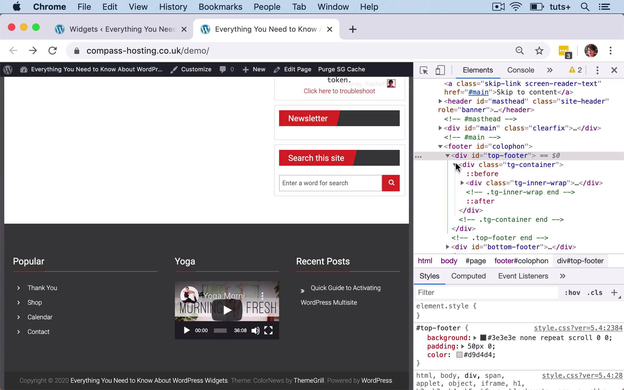 Hello, and welcome back to this Tuts+ course on WordPress widgets. In this part of the course, we're gonna start looking at widget areas. So later on, I'll show you how to code your own widget areas. But first, I'm gonna show you exactly how widget areas work, and what the difference is between a widget and a widget area. So a widget area is an area that's coded into the template files in your theme. And in this particular theme, we have 1, 2, 3, 4, 5, 6, 7, 8, 9, 10, 11, 12, 13, 14 widget areas, which is a lot. You'll find that most themes just have 2 or 3, sometimes just 1 in the sidebar. But most themes have a sidebar and a footer widget area, and maybe another one. This one I've deliberately chosen for this demonstration, because it includes lots of widget areas, so I could show you how those work. So each of these is a widget area. And then each of these inside it is a widget. Now, you might also hear widget areas referred to as sidebars. And here, it's using the terminology sidebar quite a lot in this particular theme. So it's calling this one Footer Sidebar One, which to me, is confusing. I would call this footer widget area one if I was coding it myself. But the sidebar term is also used in the code in WordPress. And that relates to the fact that when WordPress was originally coded and widget areas were created, they were only designed to go in the sidebar. Because WordPress was a fairly simple blogging platform, and the only place that you would want to put widgets at that point was in your sidebar. So sidebars and widget areas, as far as the code is concerned, became pretty much interchangeable. But it's important to remember that the sidebar can be one widget area in your theme. And here we've got a few sidebars. So there's a Right one, a Left one, and one that goes in the Contact Page, and that would be a sidebar. And then an Error Page which, again, would be a sidebar. Then these other sidebars or widget areas don't go in the side of the screen. So if I show you we've got the ones in the footer, they don't go at the side at all. So I think of those as widget areas within the footer. But you'll find that when you come to code it, we're sometimes using the word sidebar to describe widget areas. So let me show you the code that underlies this particular page in my site, to show you how widget areas and widgets are coded. So I'll inspect that, and you can see we've got the footer. So we've got a top-footer and a bottom-footer. So when I hover over top-footer here, when I'm inspecting, you can see that it highlights the whole footer. So that shows me that those widget areas are inside that. And then I've got this tg-container div, within which there's a tg-inner-wrap. And then let's just keep going down, see if we can find it. Right, and there we go, we've got tg-footer-column-3, column-3, and column-3. Now you may be thinking, why are they all called column-3? The reason for that is because they will all be styled in the same way. So you can see when I hover over them, I get a width and a height for each of them. And the height is different, because that depends on the contents. But the width for each of them is the same, and that's so that they fit within the layout of my site. So then within that div, we've got an aside, which is our navigation menu. And that is the widget. The widget area is this tg-footer-column-3. And then the widget itself is this aside, and you can see that one of the classes for this is widget. And it's also got a class of widget_nav_menu, which is a class that's added by that specific widget that's provided with WordPress. Now when I'm coding my themes, I like to use widget area in the classes for my actual widget area. So if I show you one of my own sites and then scroll down to the footer, I'll inspect that. And you can see here, I've got a div, first one-third left, and that's layout styling. And this has got widget-area as a class. And then I've got widget-container in there for the actual widget. So this is a Twitter timeline widget. So depending on the actual widget and the theme, the classes that you find might be slightly different. But what you will find is that all your widgets are nested within one widget area. So if you're ever needing to style widgets within your theme, you need to identify whether it's the widget area you're targeting with your styling, or the widget itself. So that's the difference, let's turn off inspect. That's the difference between a widget and a widget area. These are all widgets, and we place them inside widget areas. So you can code either of these. You can add a widget area to your theme by writing code to do so, or you can code a widget. And if you're coding your own widgets, you generally do that within a plugin. Because that way you get to use your widget, whichever theme you're using it in. And if you switch themes in future, you can still use the widget from your plugin. So in the next part of the course, I'm gonna show you how to add an extra widget area to your theme, so that you can add widgets to it. See you next time, and thanks for watching.