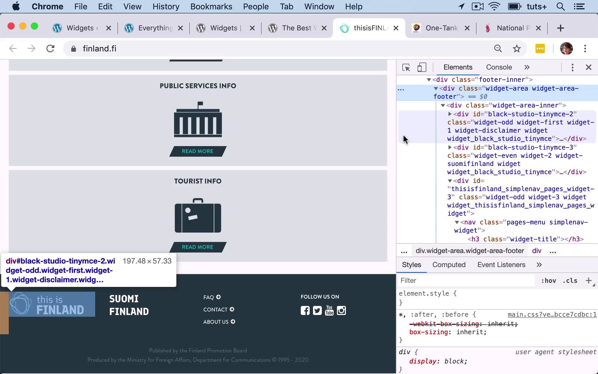 Hello, and welcome back to this Tuts+ course on WordPress Widgets. In this course, I'm gonna give you a more detailed introduction to Widgets and show you exactly what they are and where you might use them in on your site. So I've got a demo site that I've set up here that I'm gonna use throughout this course and I've deliberately picked a theme for my site, that includes lots of widget areas as you can see here. Now you'll find that how many widget areas you have available to you depends entirely on your theme, because widget areas are coded into the theme and they tend to be coded into specific theme template files, such as sidebar.php and footer.php. And that's because the most common places for widgets are your sidebar and your footer in your site. But as you can see here, there are plenty of other places that you can add widgets to your site. So in this theme, we've got two sidebars and which one will be displayed depends on the page template that you use for an individual page, because the theme includes multiple page templates with different layouts. We've also got a Header Sidebar, so that's a widget area in the header and contact page specifically on that page for a four page Front Page. There's 1, 2, 3, 4, 5 widget areas in the front page, then there's a widget area for above the footer to put an advert and then there are three sidebars or widget areas in the footer. So that means that those three widget areas in the footer can be laid out side by side so you can put an item or a widget in each of them, and you'll have all three next to each other. So you can choose to add widgets to as many widget areas as you want. So here you can see in the Right Sidebar, I've got a Search box and I've also got some Text. And as we go through this course, I'll be adding more widgets to these widget areas and I'll show you exactly what effect that has. So let's take a look at some sites that give us examples of how widget areas can be used. And you'll see that most sites don't actually use quite this many widget areas, although I think they're really useful, I like to have lots of widget areas in my sites so that gives me flexibility to add more content if I want to also at the main content of the post. And if your theme does not include widget areas in the places where you like them, you can add your own widget areas, which we'll see later on in the course. So let's take a look at some examples from the WordPress website showcase on the WordPress.org website. So I found a few that have widget areas, so here we have the this is FINLAND site and that's got widget areas right down in the footer. So these here are all widget areas and you can tell their widget areas by inspecting the code. So I'm just gonna make this a bit smaller so you can see the desktop layout. And then down here if I do Inspect, so you can see here, we've got the word widget in here. So we've got div_class="footer-inner" and then within that, we've got a widget-area called widget-area-footer. So the theme being used for this site, we'll have one widget-area in the footer, that's called widget-area-footer or footer widget area, probably. And then within that a number of widgets have been placed and the styling in the theme and the theme stylesheet is placing those widgets next to each other. So instead of having three widget areas side by side, like in my theme here, which is just as valid, this particular site has got one widget area with multiple widgets. Now if you're developing a theme for your own site, or you're adding widget areas to a theme for your own site, you've got a lot more control over the layout of the widgets within that widget area. So you can choose to just add one widget area and add multiple widgets. But if you were producing a theme for use by other people that you were gonna upload to the WordPress theme directory, if you added one widget area in the footer and then added styling to your theme to lay them out next to each other, each of these will be taking up a quarter of the width of the screen on this screen size. If you did that, and somebody then added five widget areas, it will completely mess up the layout. So you can see why in this theme, which I downloaded from the theme directory, they've added three widget areas so there's more control over exactly how those are laid out. So here's another site canada.com, and this has got widget areas in the sidebar here, so I'm looking at an individual post. So in the sidebar, we've got our most popular widget here, we've got some adverts which are kept in widgets, and then again, down the bottom we have a footer and this has got some menus in it. So you can create custom menus in your site using the menu screen just as you would for your main navigation menu and you can add as many custom menus as you want and you can then add those menus to your footer or your sidebar using a widget, which I find incredibly useful particularly for users on mobile. And most of the people coming to your site will be on mobile, because when they get all the way down to the bottom of a post on mobile, they would have a very long way to scroll back up again to go back up to your main navigation menu. So you want to make it as easy as possible for them to find more content and putting a menu in a widget area in your footer is a great way to do that. And then here's another site, the national puerto rican day parade. So this one has a very different layout, it's got a full width layout and all of this is coded into the theme, it's not widgets. But if we go down to the bottom, there are widgets in the footer. So we've got widgets for Facebook and Twitter and then we go further down, right down here in the footer, we've got a variety of widgets laid out next to each other here. So we've got Instagram widget, a Twitter widget, a text widget with information about contacting them and then again, a menu. So you can see there are a whole variety of different types of widgets that y