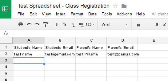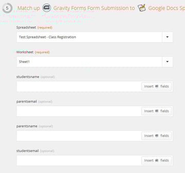 I called my spreadsheet "Test Spreadsheet - Class Registration". As soon as I created it I was able to find it in the drop down in part five on Zapier and select it. For the Worksheet selection, I'm planning on my spreadsheet having only one page, so it brought up that worksheet and I selected it.