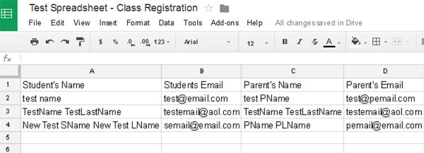 You'll see the first row is the headings that I originally gave each column. Row 2 includes the sample answers I set up when I created the spreadsheet. Row 3 has the test answers that Zapier sent when it connected to the spreadsheet. And row 4 is my final test submission through my website - it works!